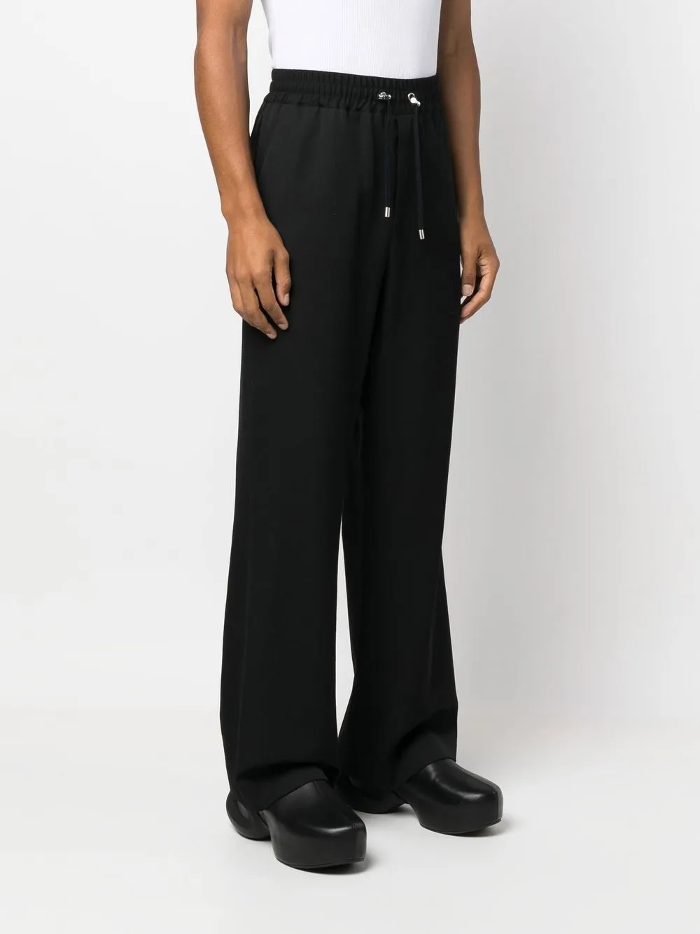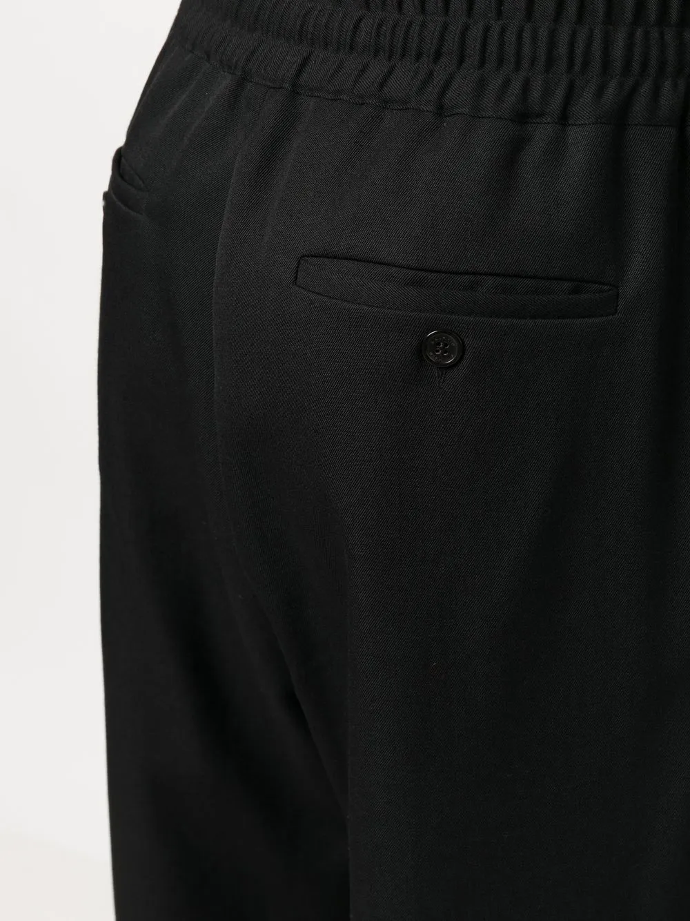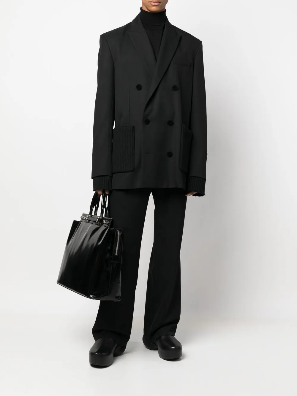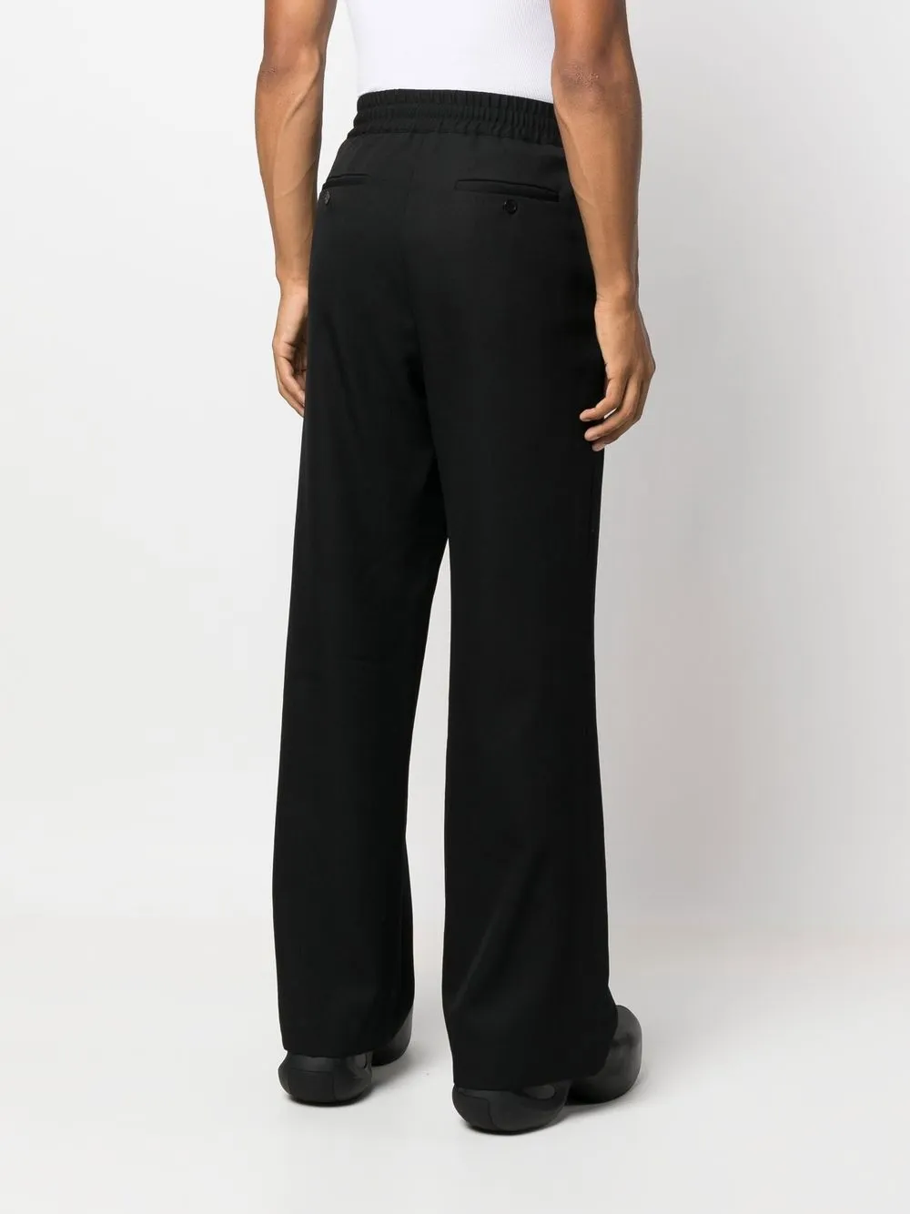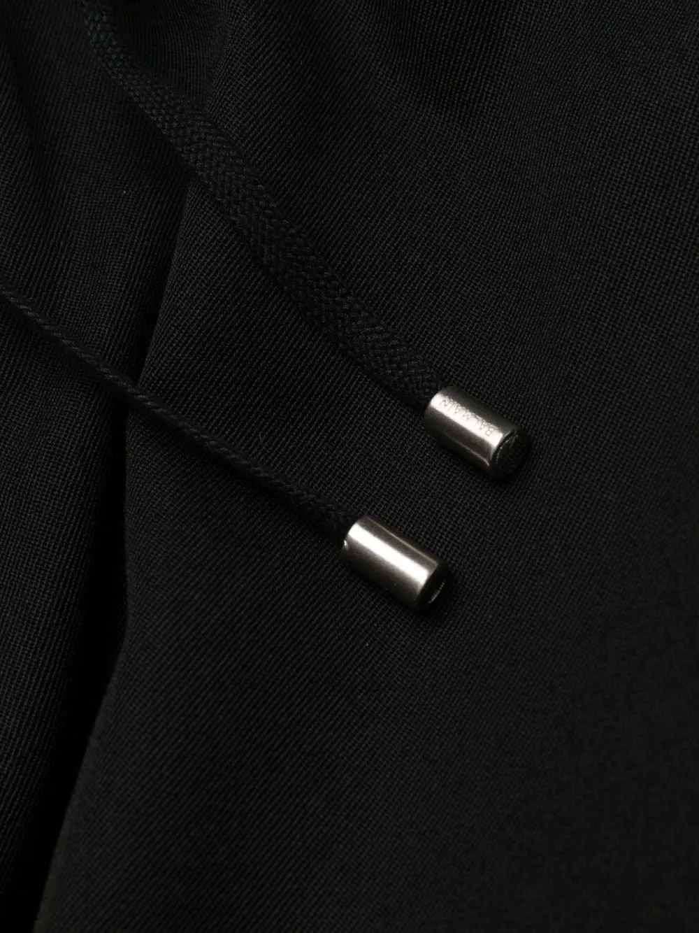 Черный, шерсть, кулиска на талии, два вшитых кармана по бокам, два прорезных кармана на пуговицах сзади, широкий крой и экстрадлинная модель.