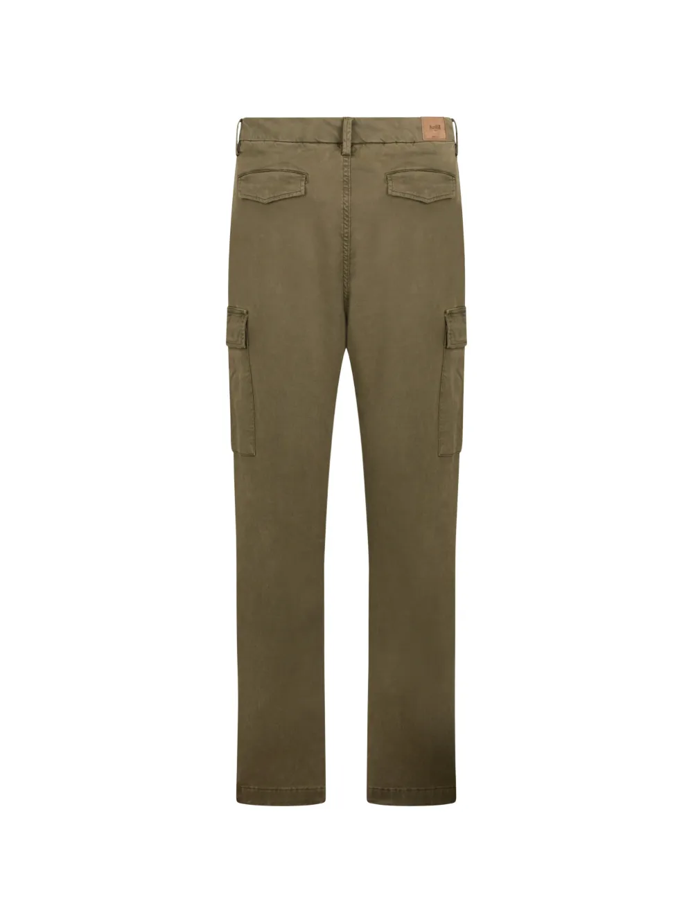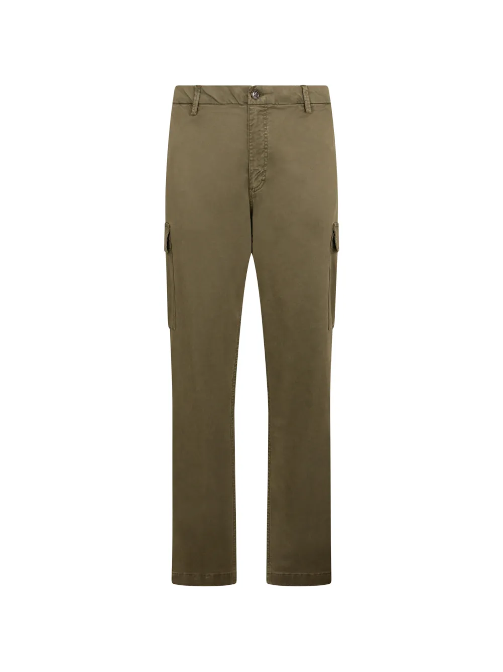 Оливковый цвет, боковые карманы грузового типа, шлевки для ремня, задние карманы с клапанами, застежка на пуговицах, прямые брючины