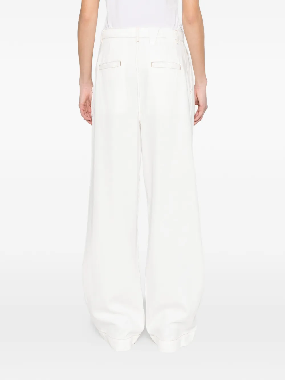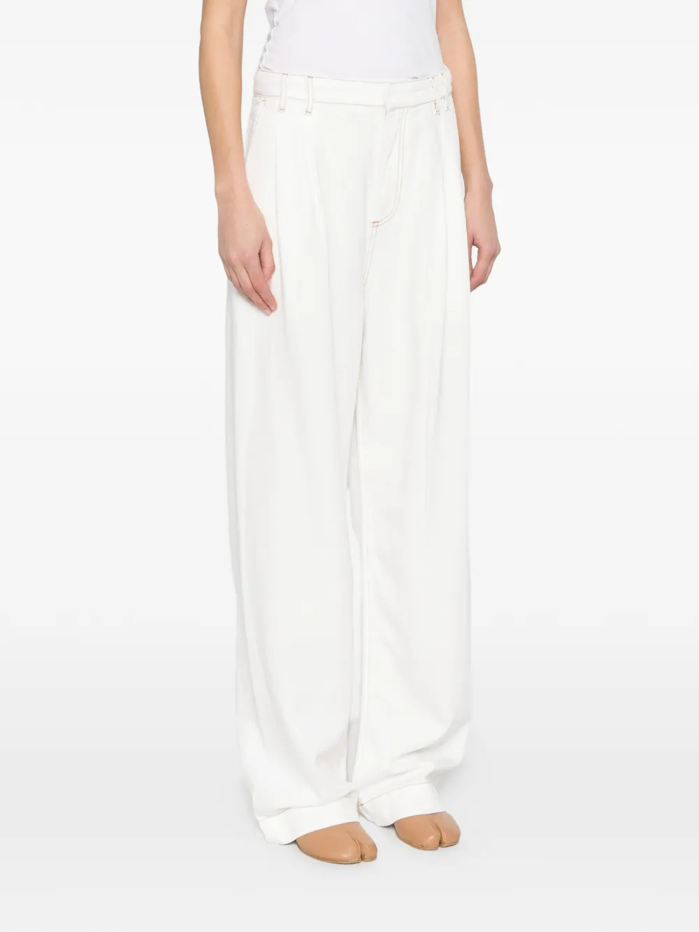 Выбеленный белый цвет, контрастная строчка, складки спереди, широкий прямой крой, подрубленный край брючин, боковые карманы