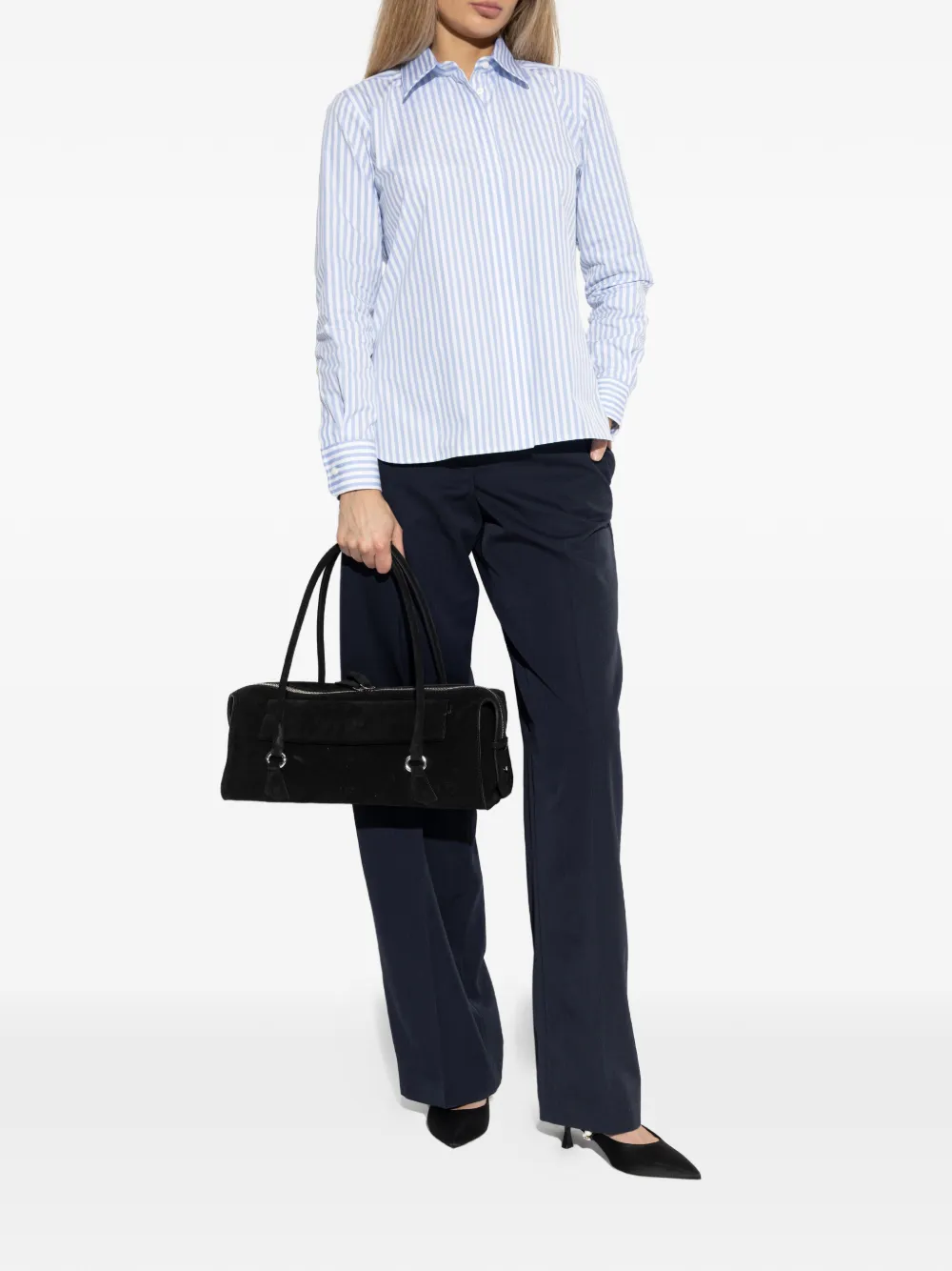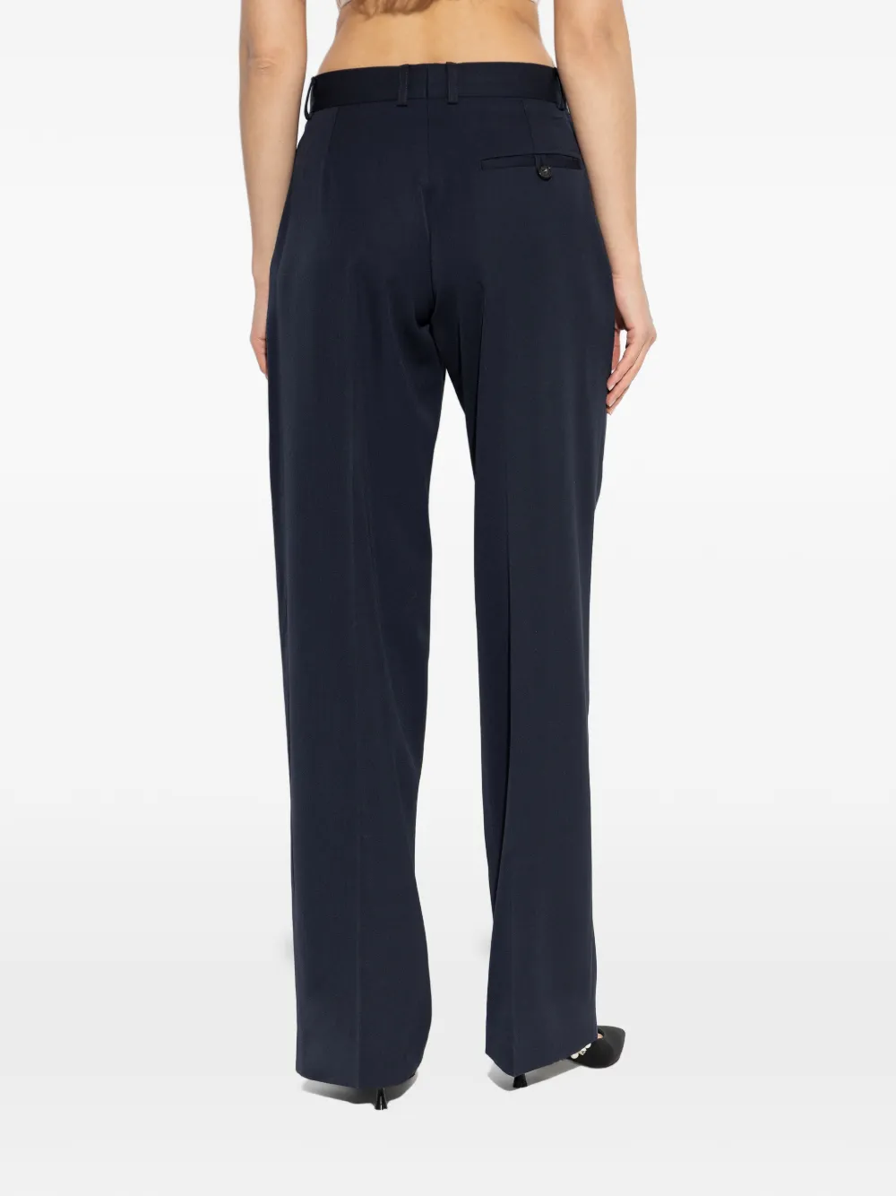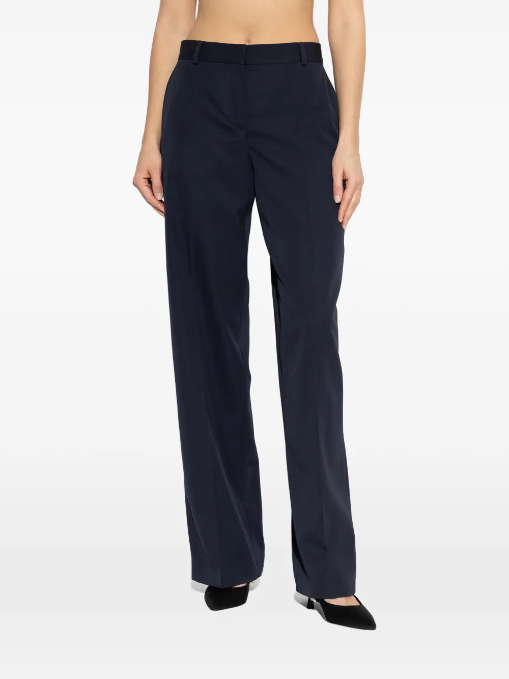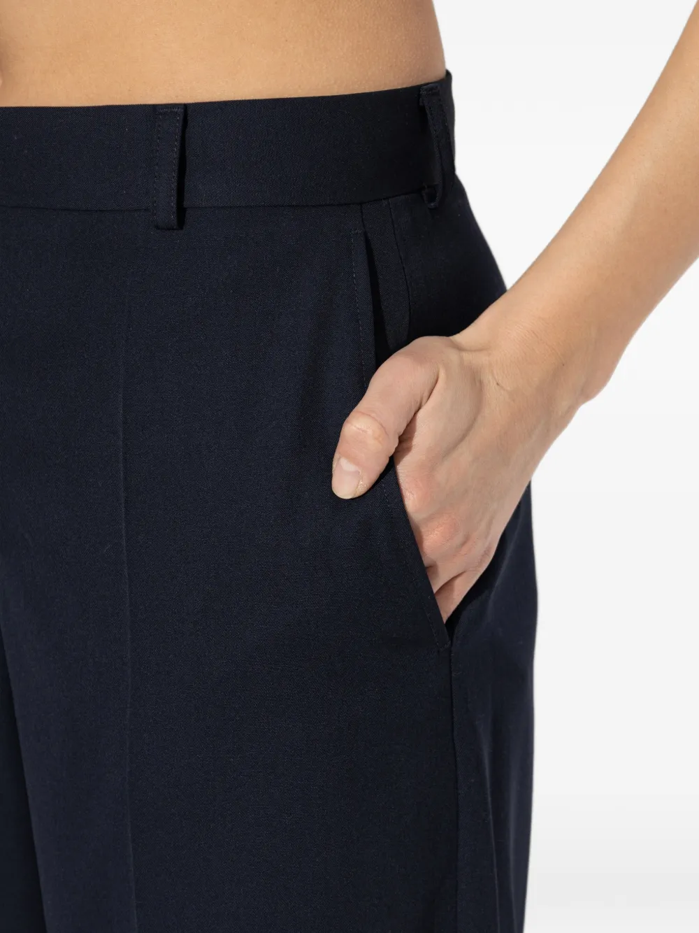 Темно-синие шерстяные брюки с шлевками для ремня, боковыми карманами в швах, застежкой на пуговицы, прямыми штанинами