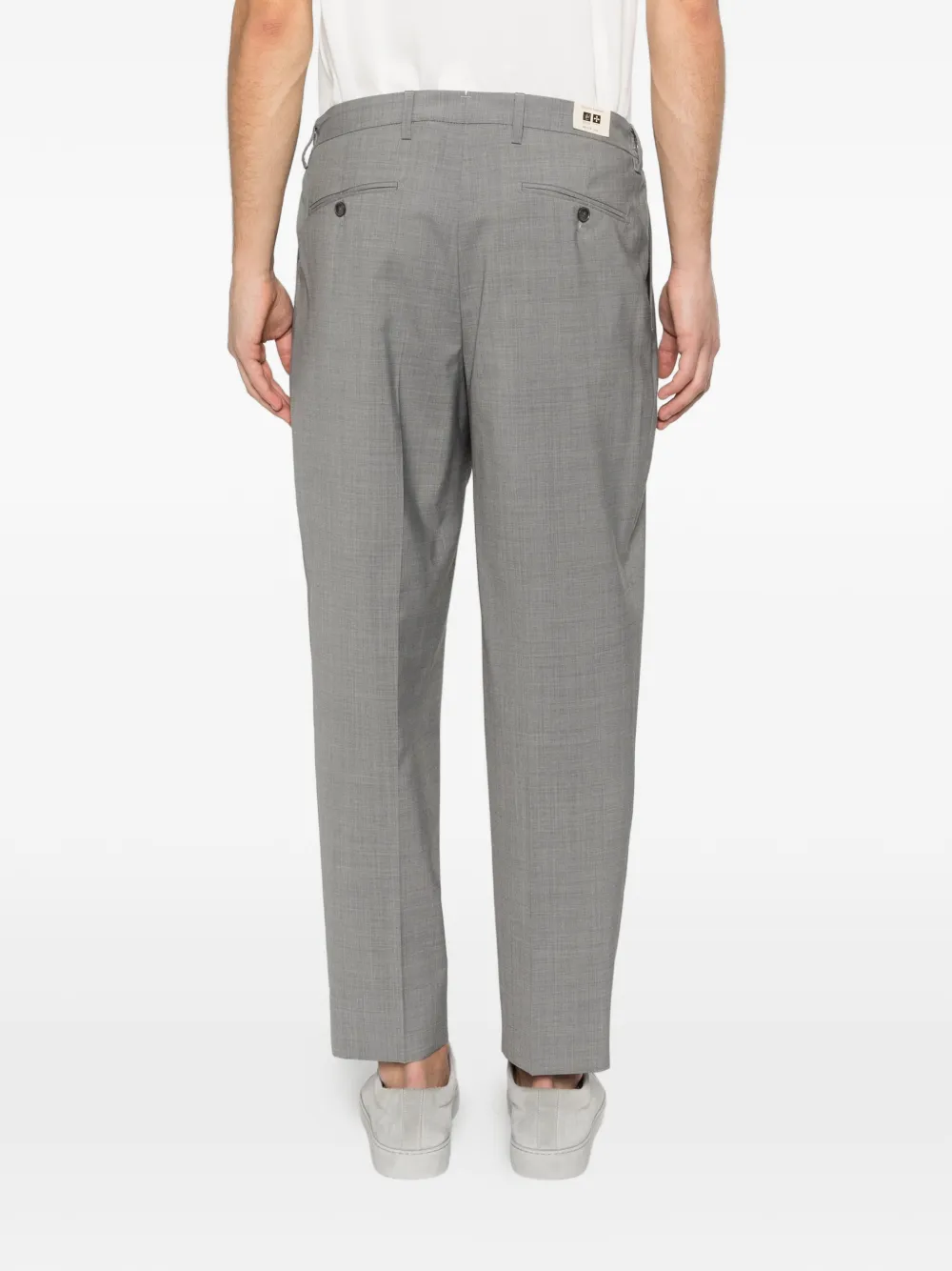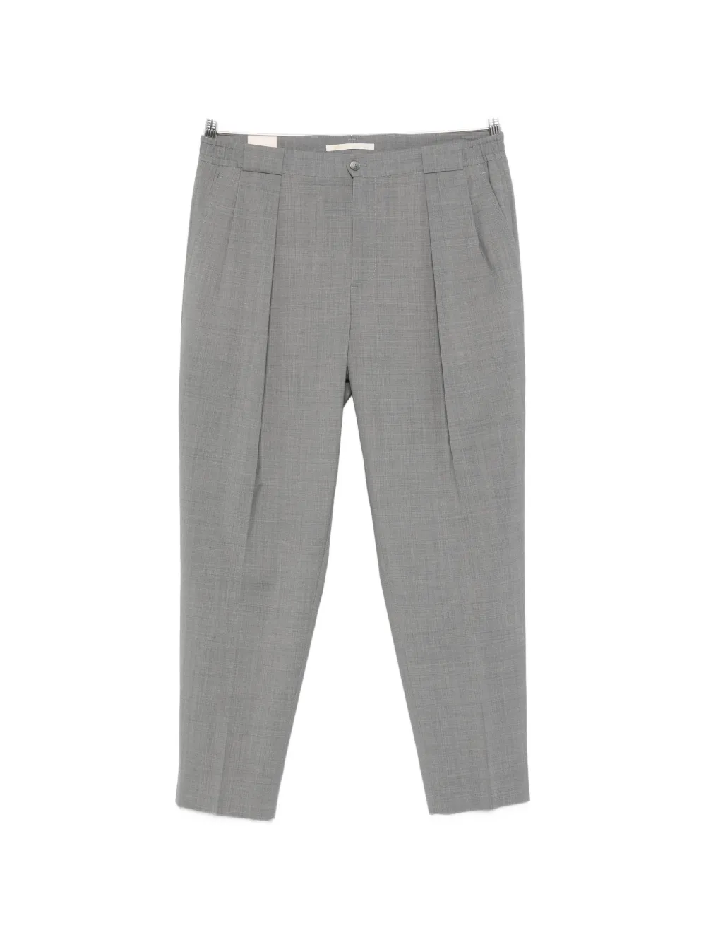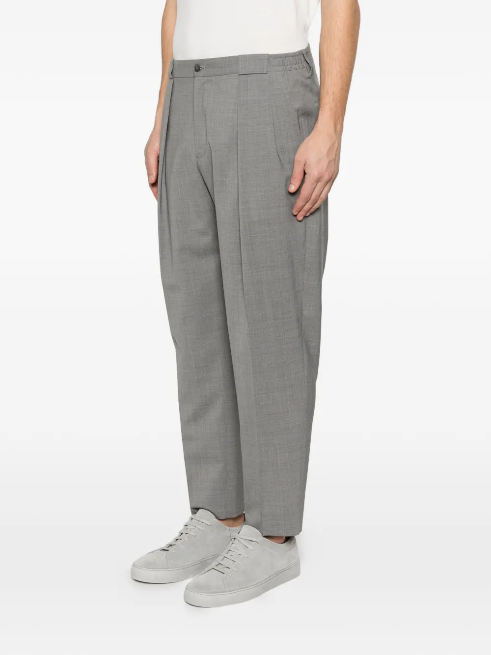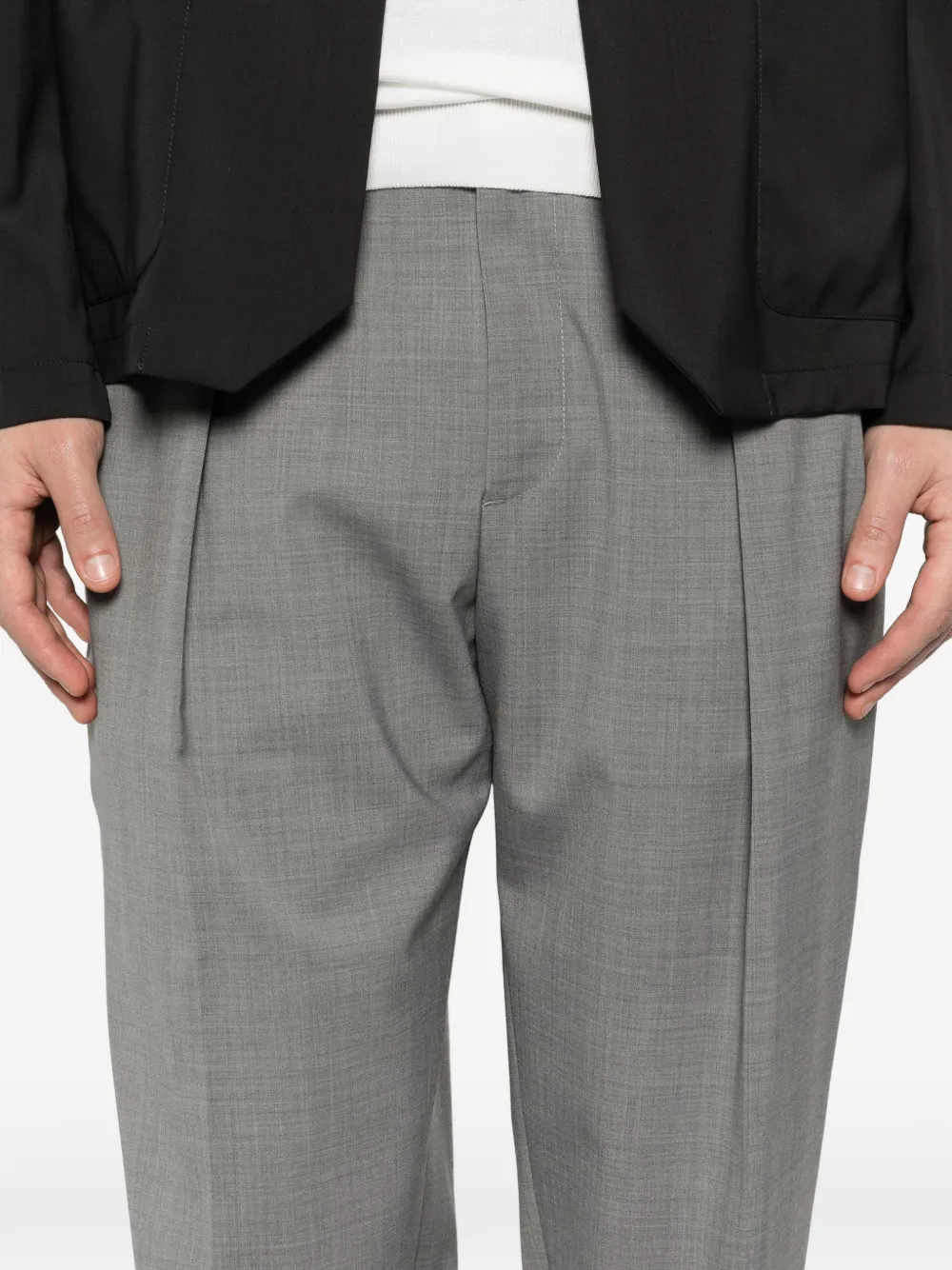 Серые брюки со складками спереди, застежкой на пуговицы, шлевками для ремня, прямыми штанинами и тональной строчкой