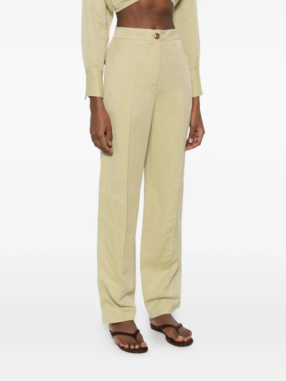 Зеленый цвет, боковые карманы, застежка на пуговицы спереди, панельный дизайн, прямые брюки, эластичные манжеты