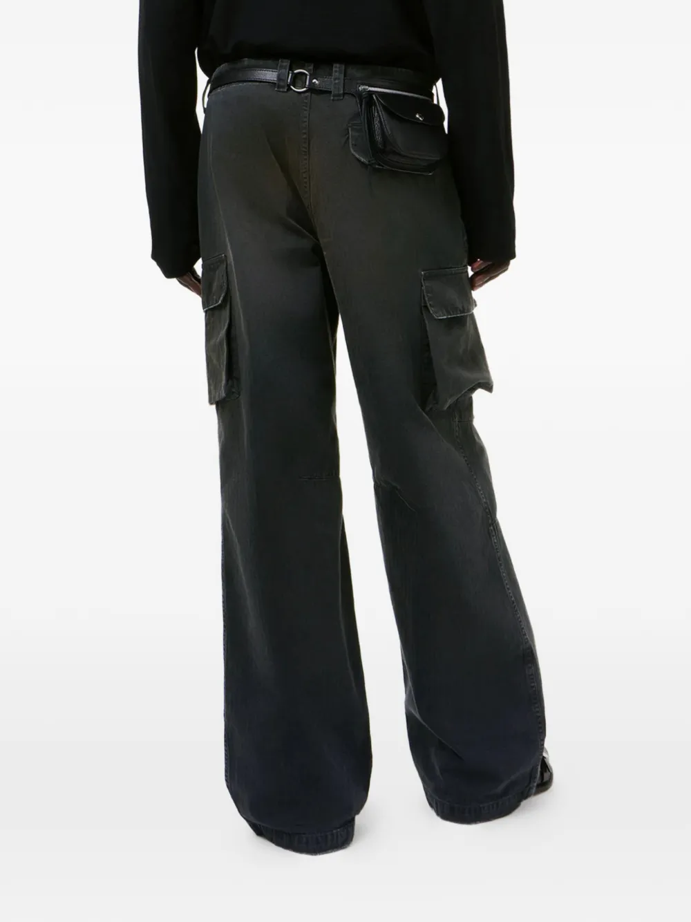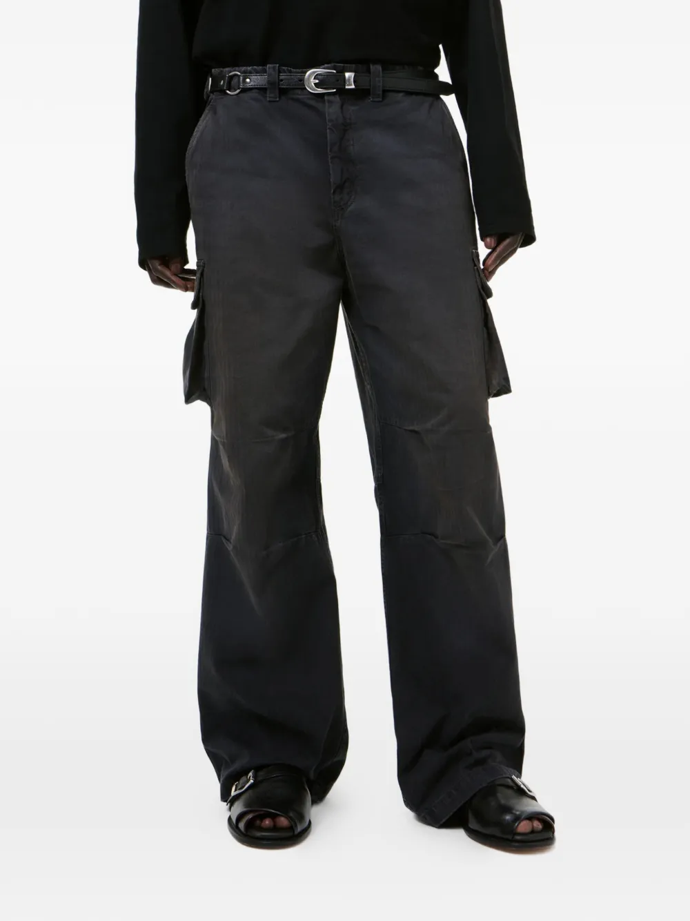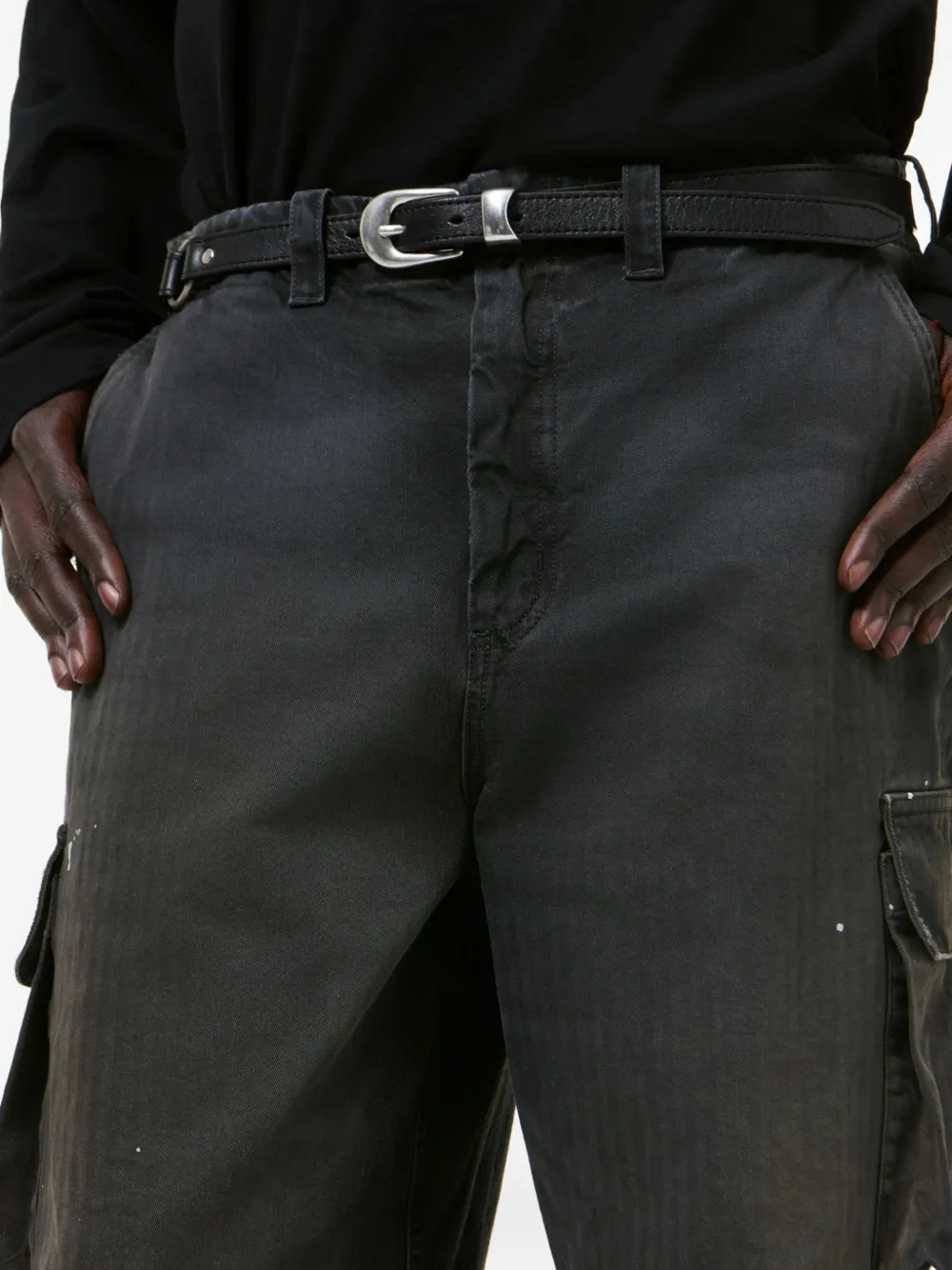 Черные брюки карго с карманами, застежкой на пуговицы, шлевками для ремня, в елочном (шевронном) плетении