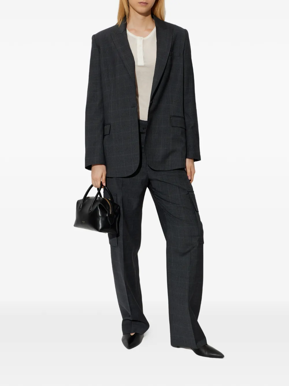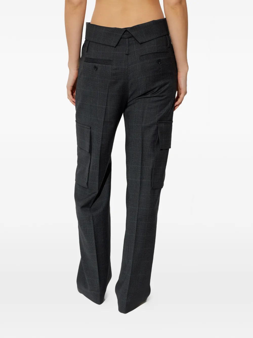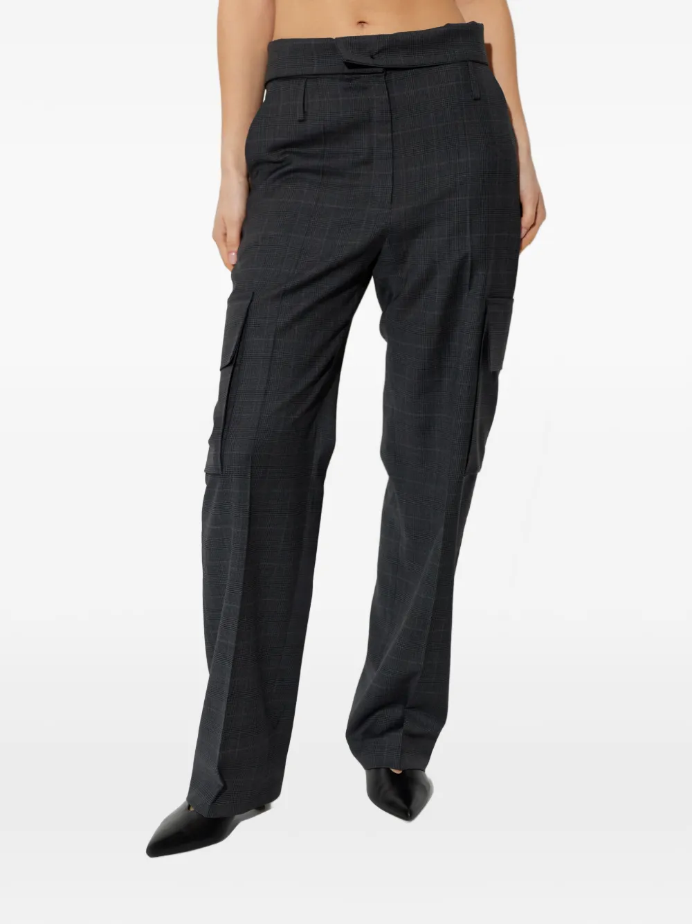 Темно-серый в клетку, шлевки для пояса, боковые карманы карго, задние прорезные карманы, прямые брючины
