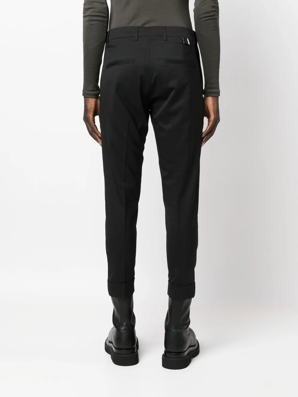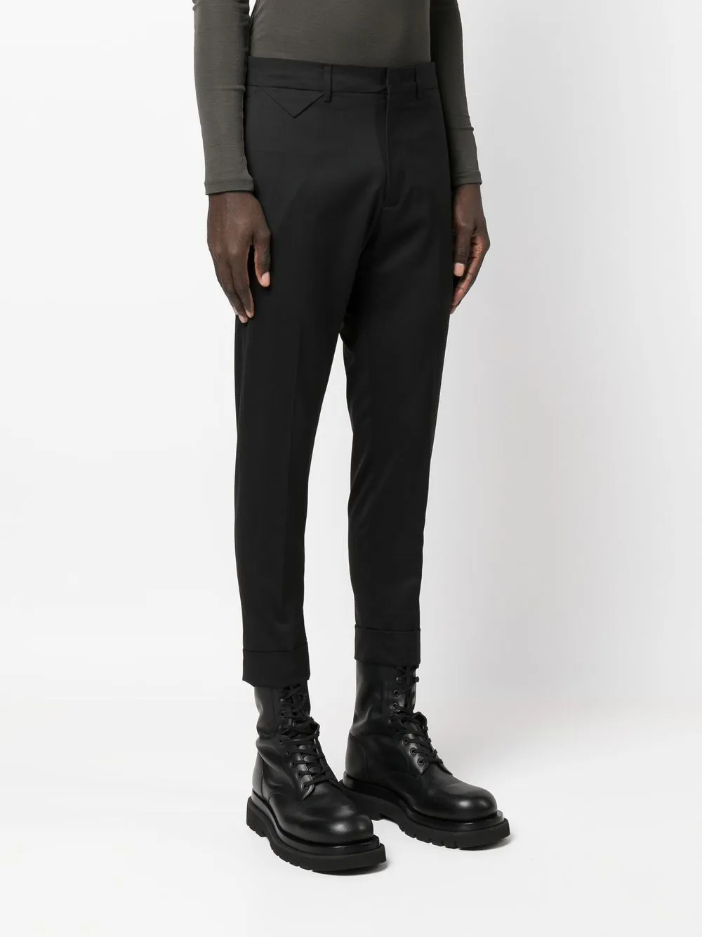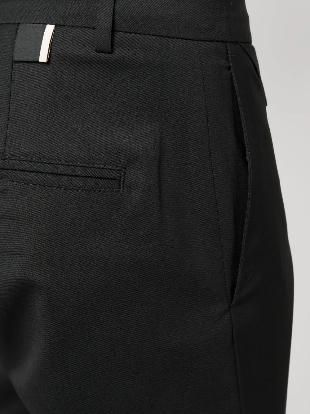 Черный, смесовая необработанная шерсть, эластичный пояс, прямой крой и два кармана с листочкой сзади.
