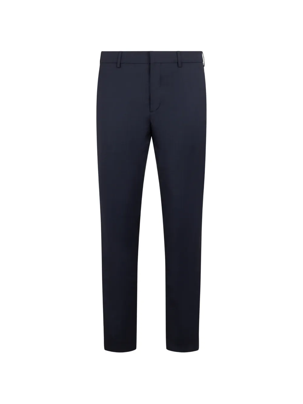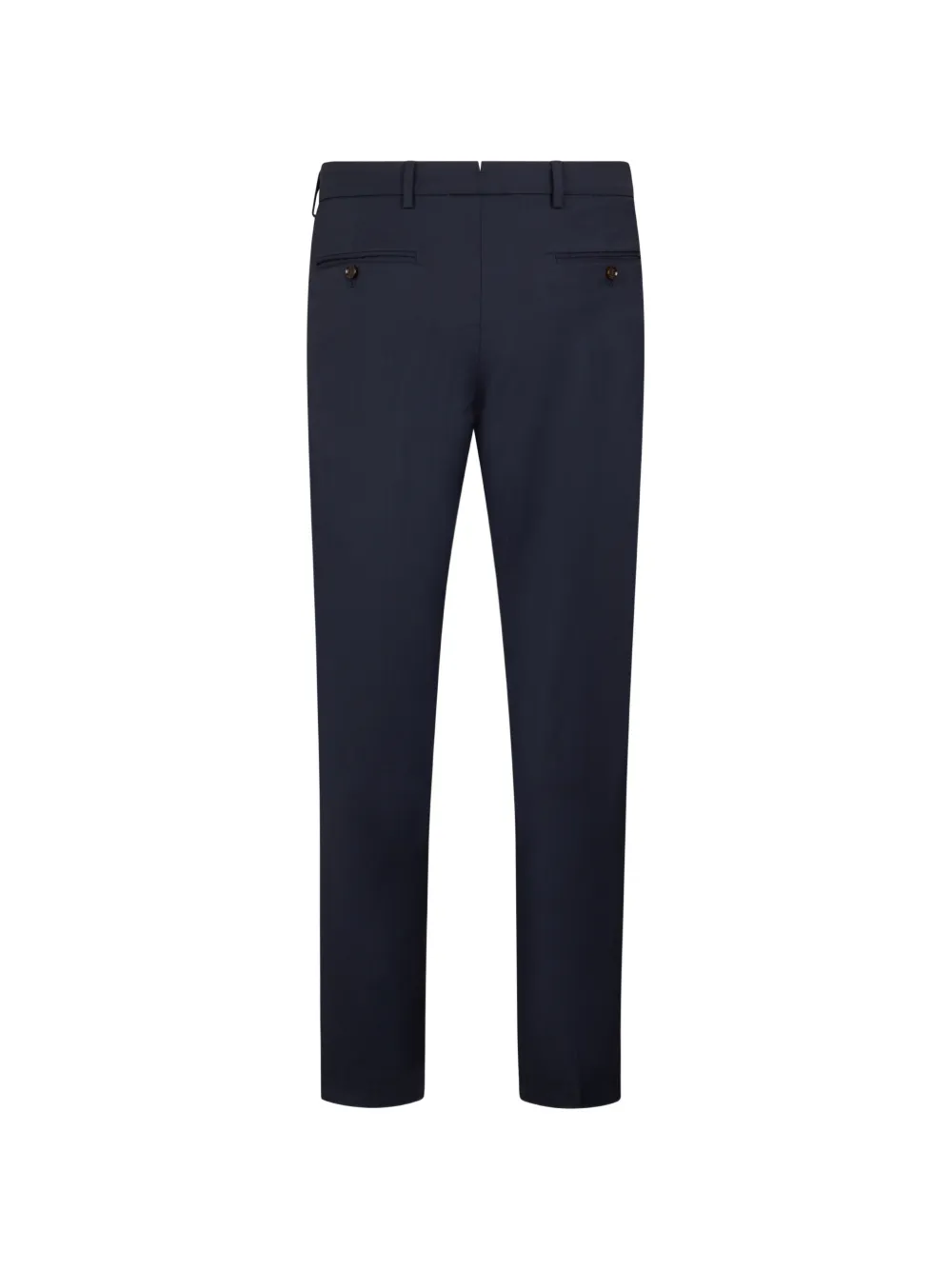 Темно-синий цвет, скрытая фронтальная застежка, шлевки для ремня, задние карманы, приталенный крой