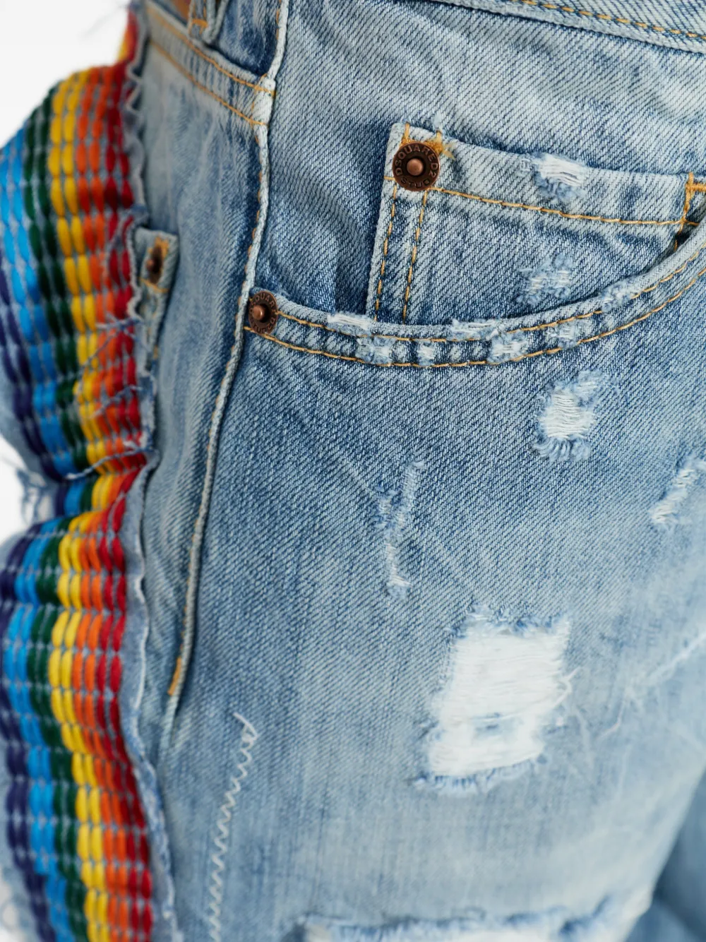 Светло-голубой хлопок, эффект потертости, радужные детали, застежка на пуговицы, пять карманов