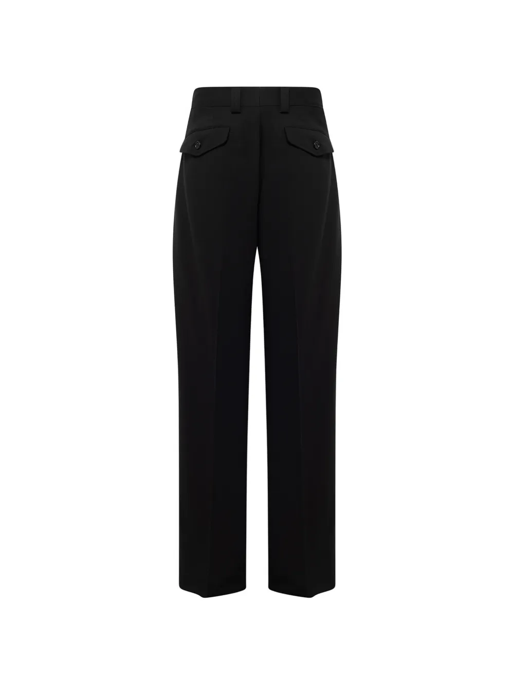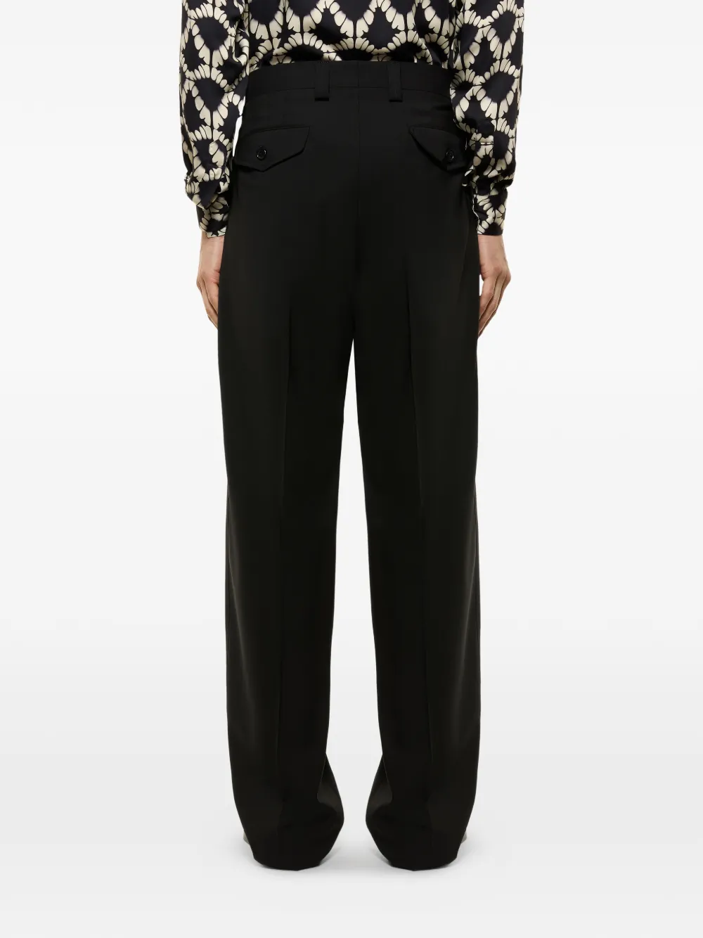 Черная застежка на пуговицу, задние карманы на пуговицах, складки спереди, шлевки для ремня