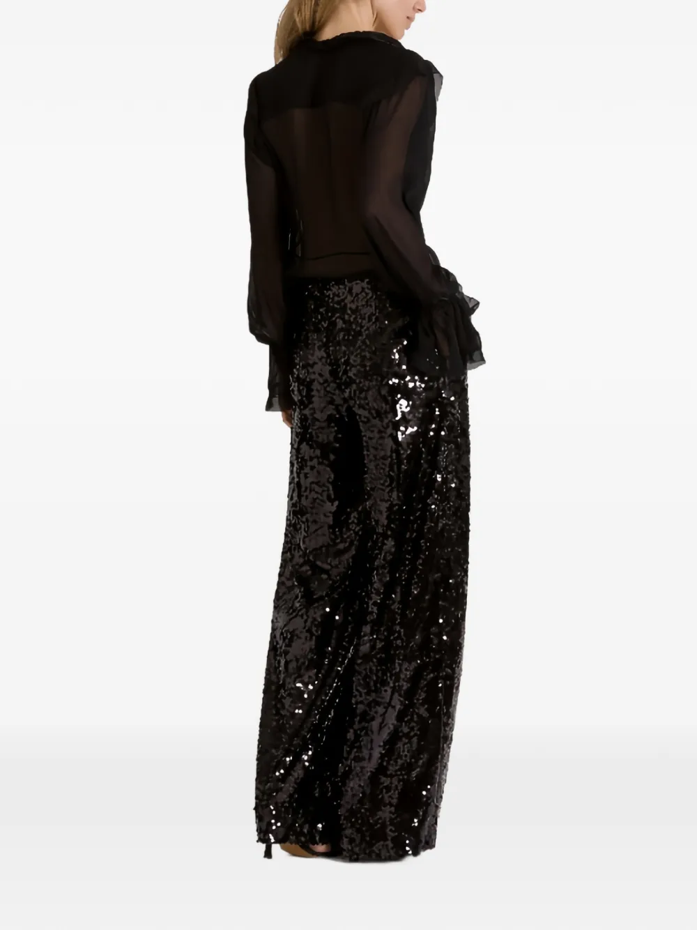 Черные широкие брюки с пайетками, боковыми карманами, высокой посадкой и скрытой застежкой