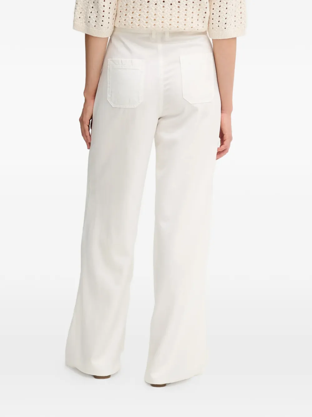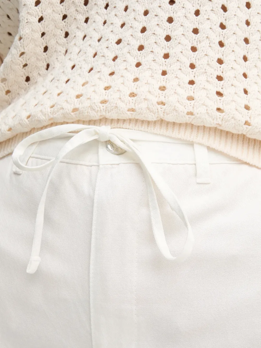 Белые прямые брюки с завязками на талии, задними накладными карманами и шлевками для ремня