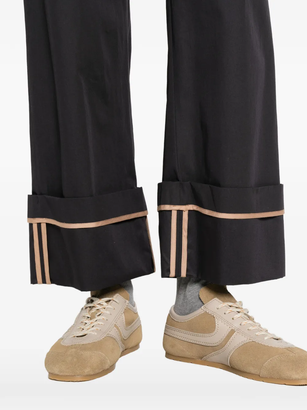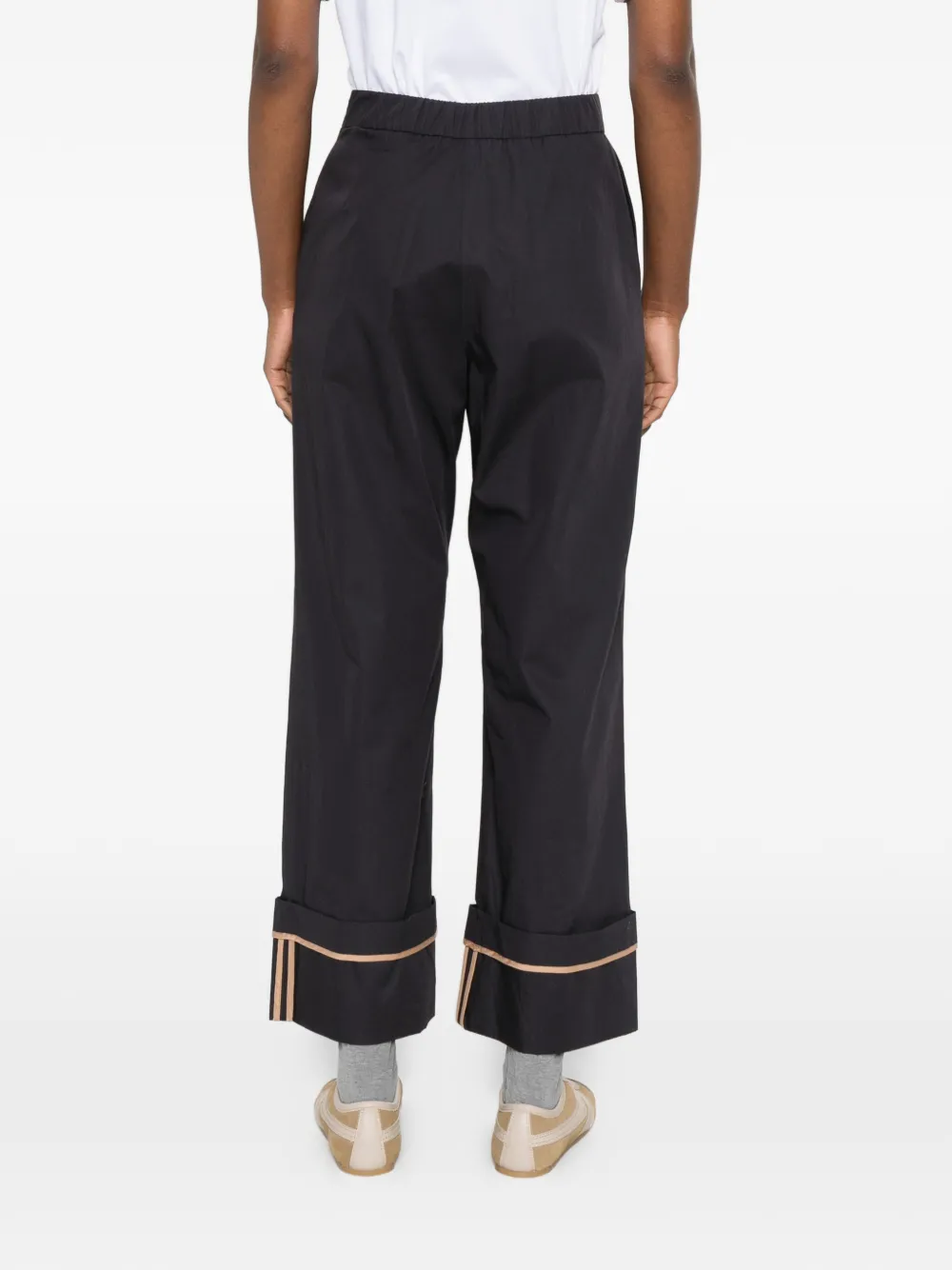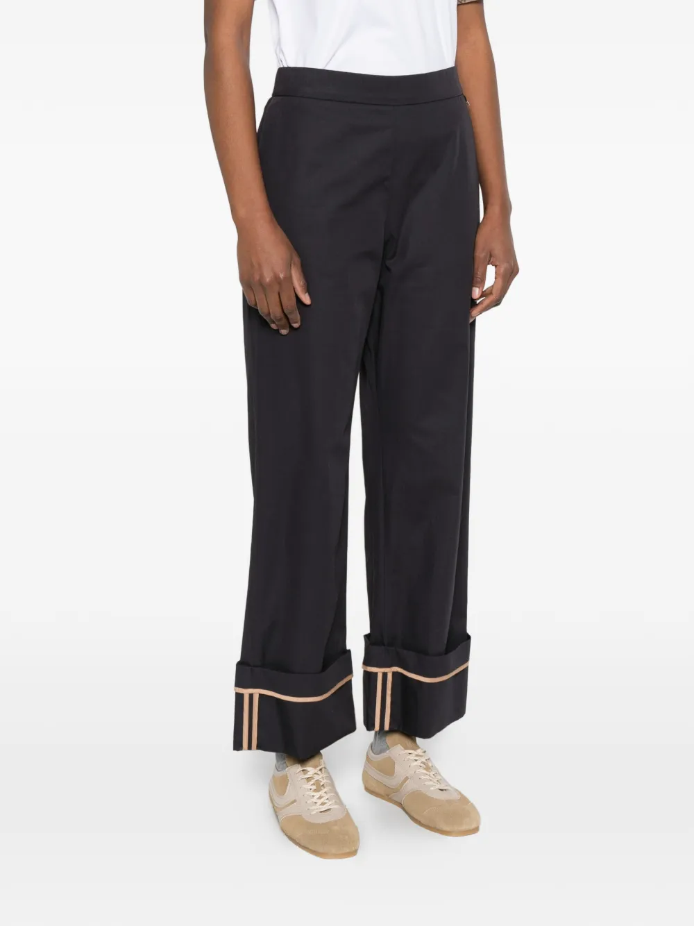 Темно-синие брюки-клеш с подвернутым краем, полосатыми деталями и прорезными карманами