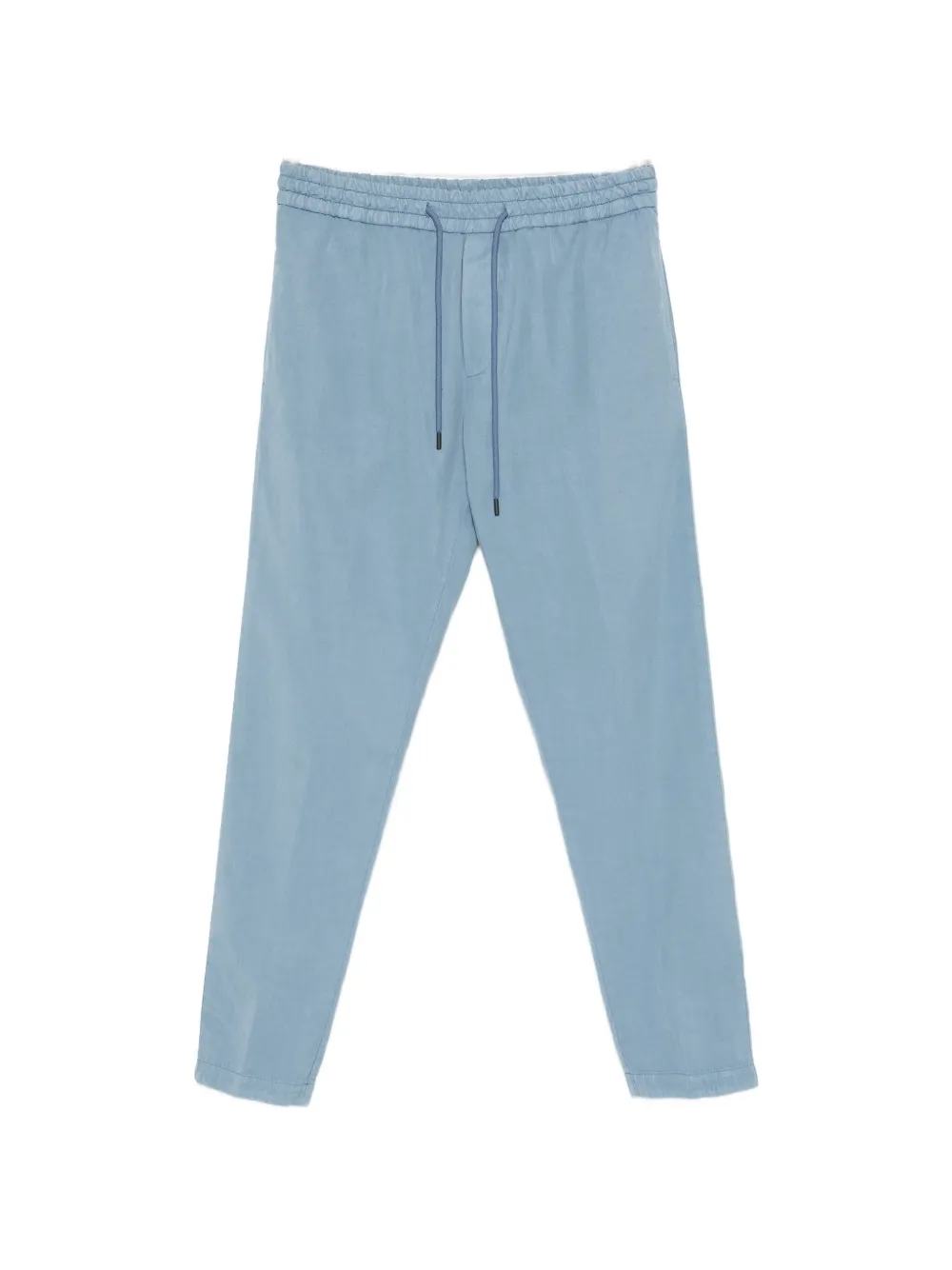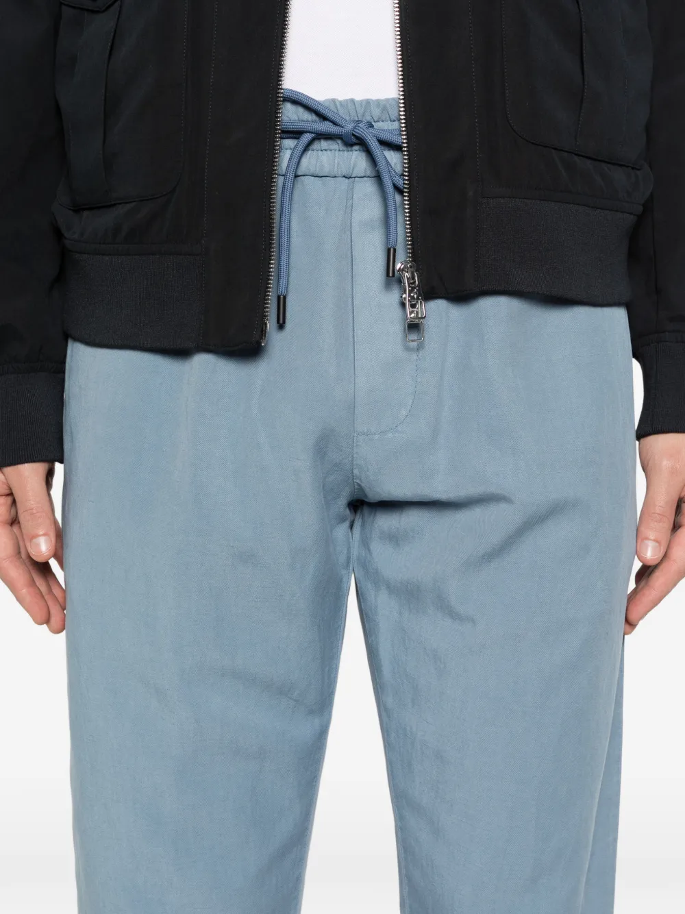 Светло-голубой цвет, эластичный пояс на завязках, тональная строчка, подвернутый край