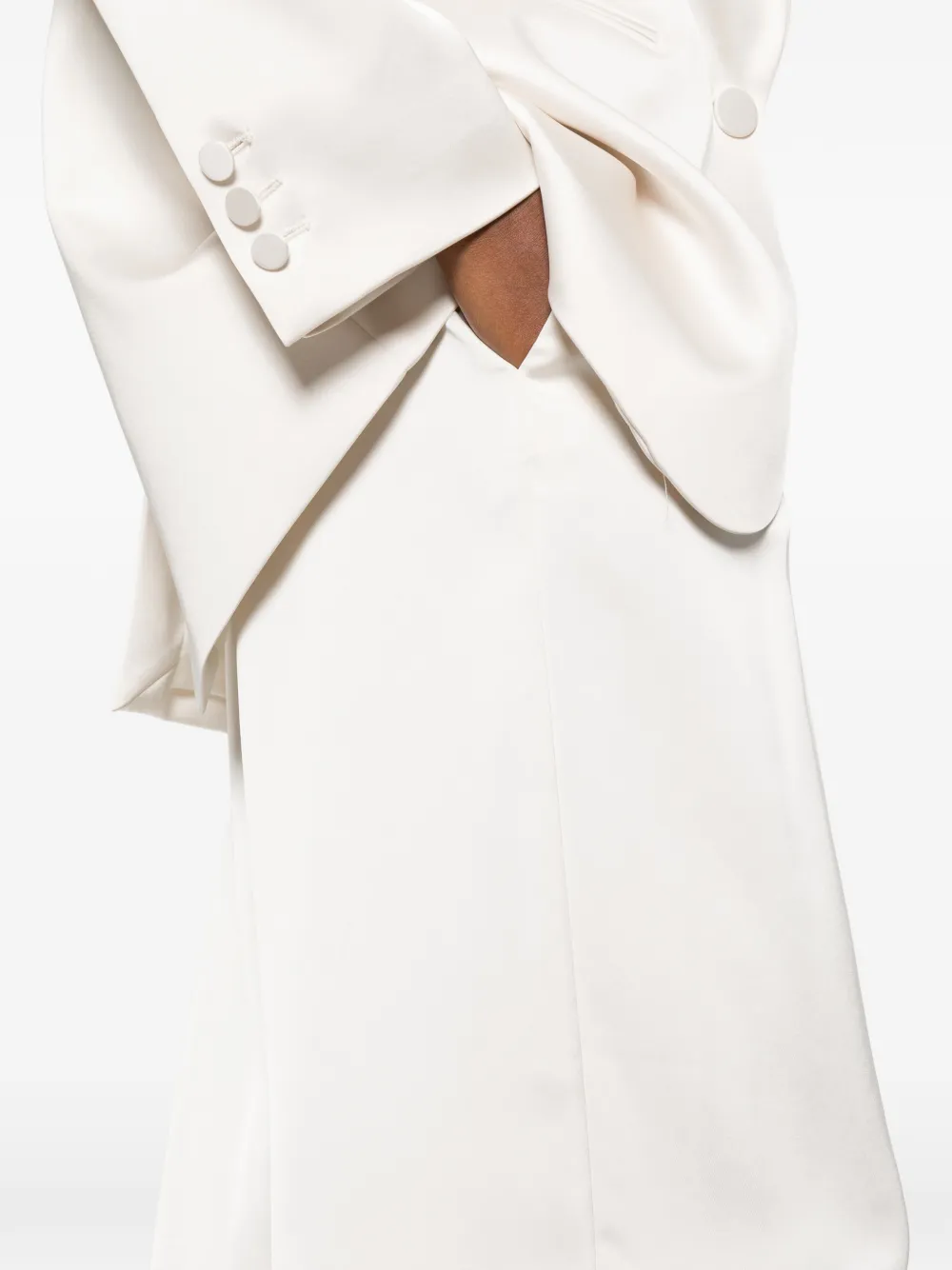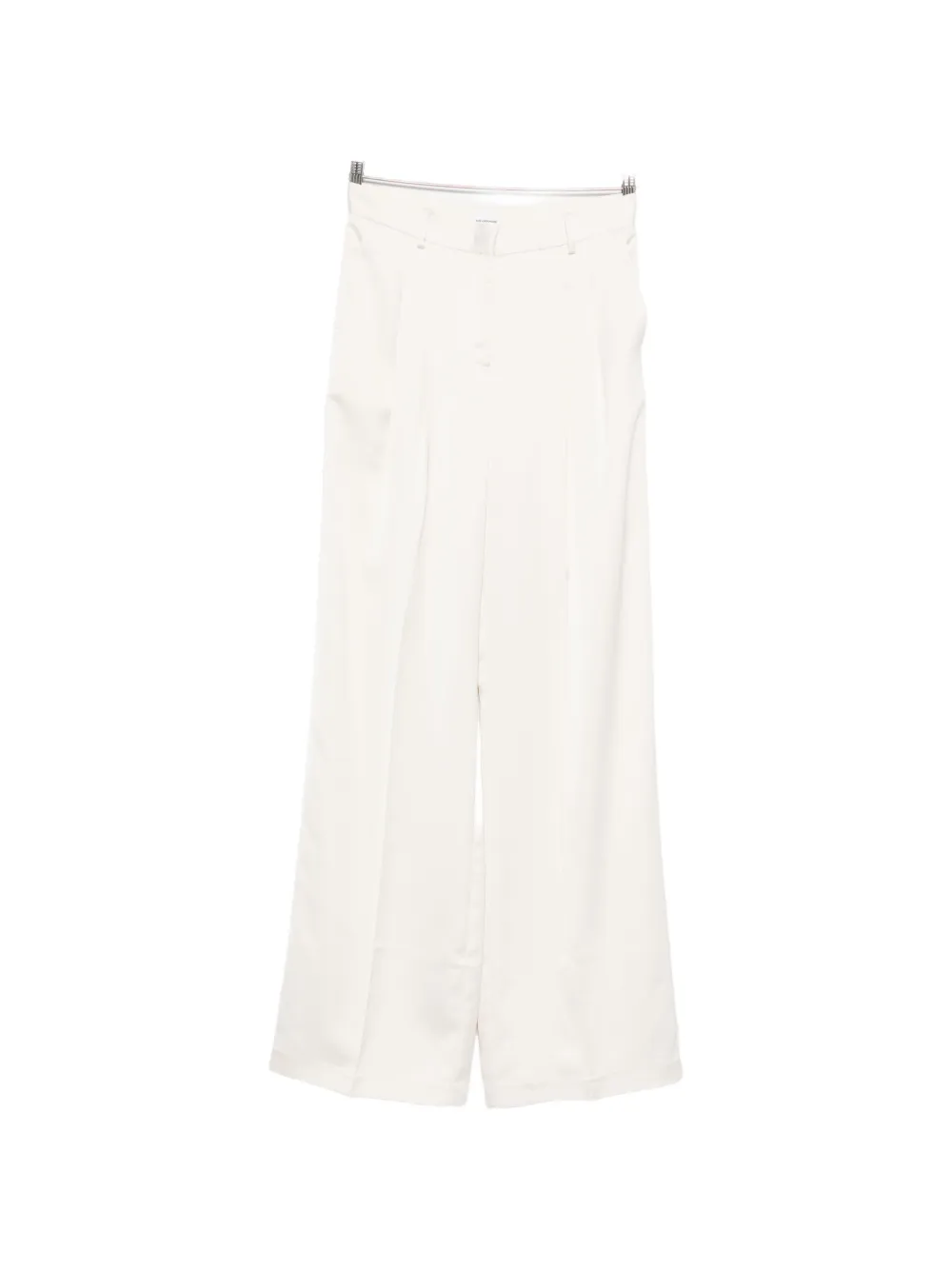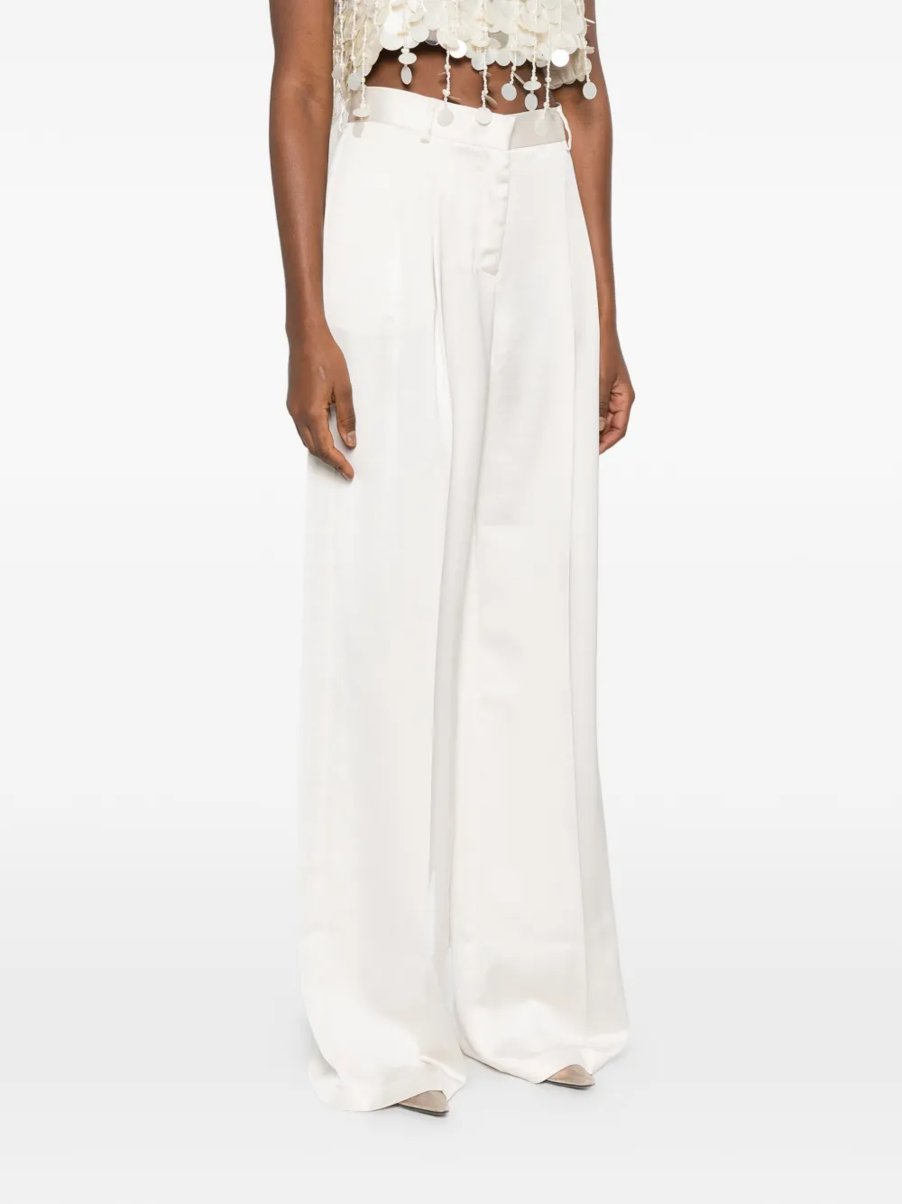Белые широкие брюки с защипами спереди, шлевками для ремня и скрытой застежкой
