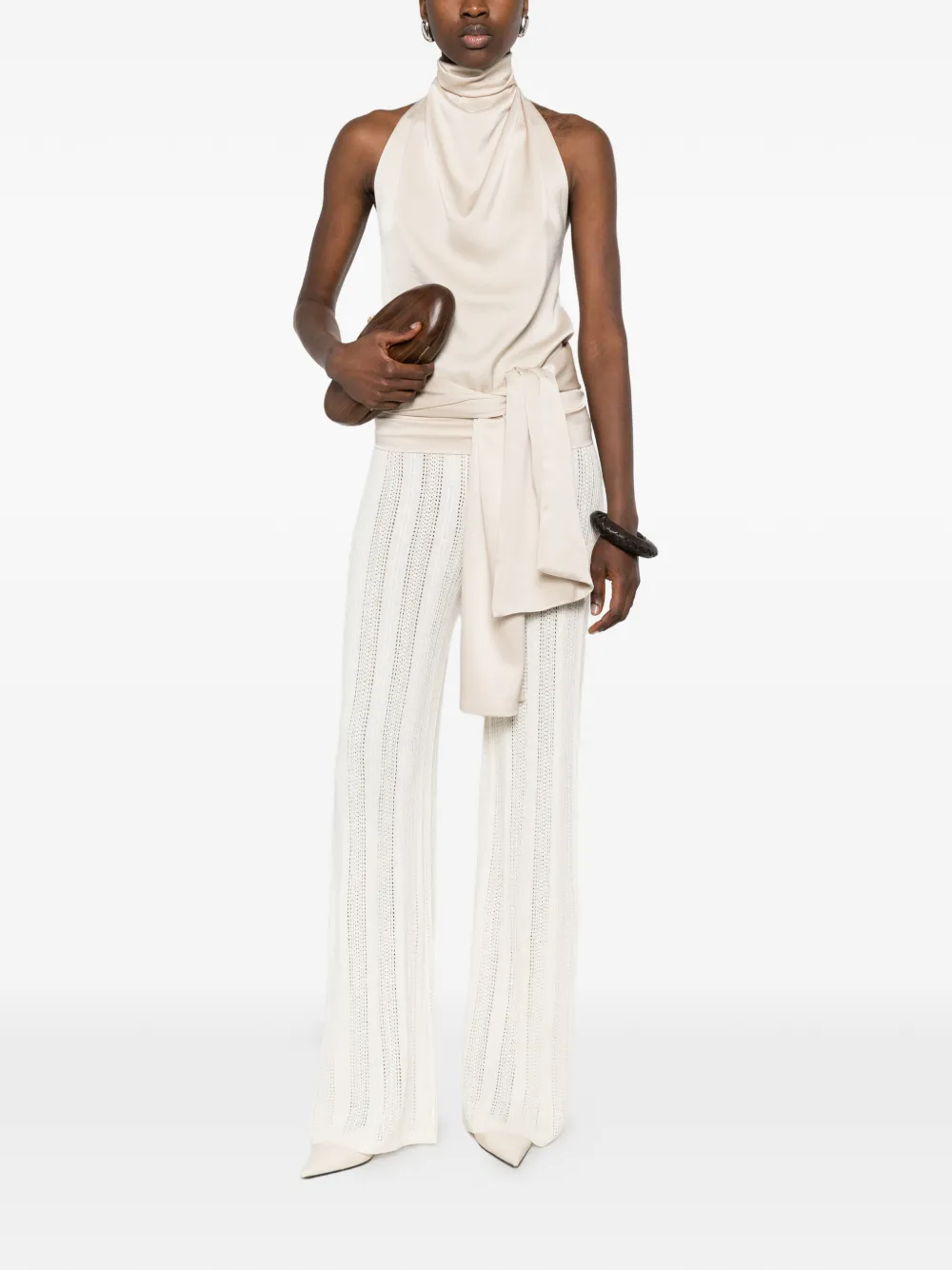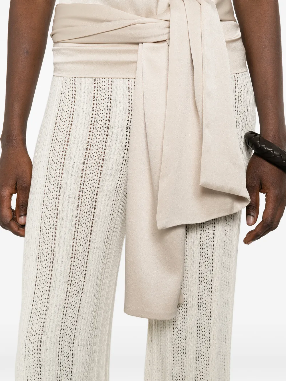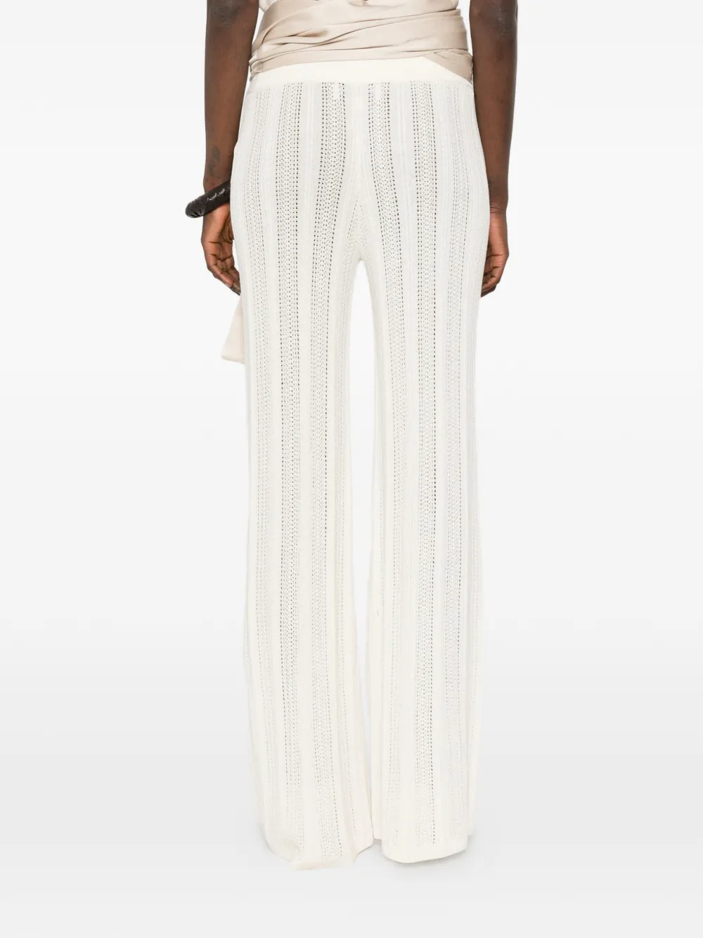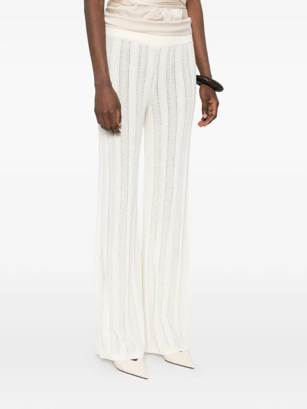 Бежевые широкие брюки из ажурного трикотажа с эластичным поясом, длинные