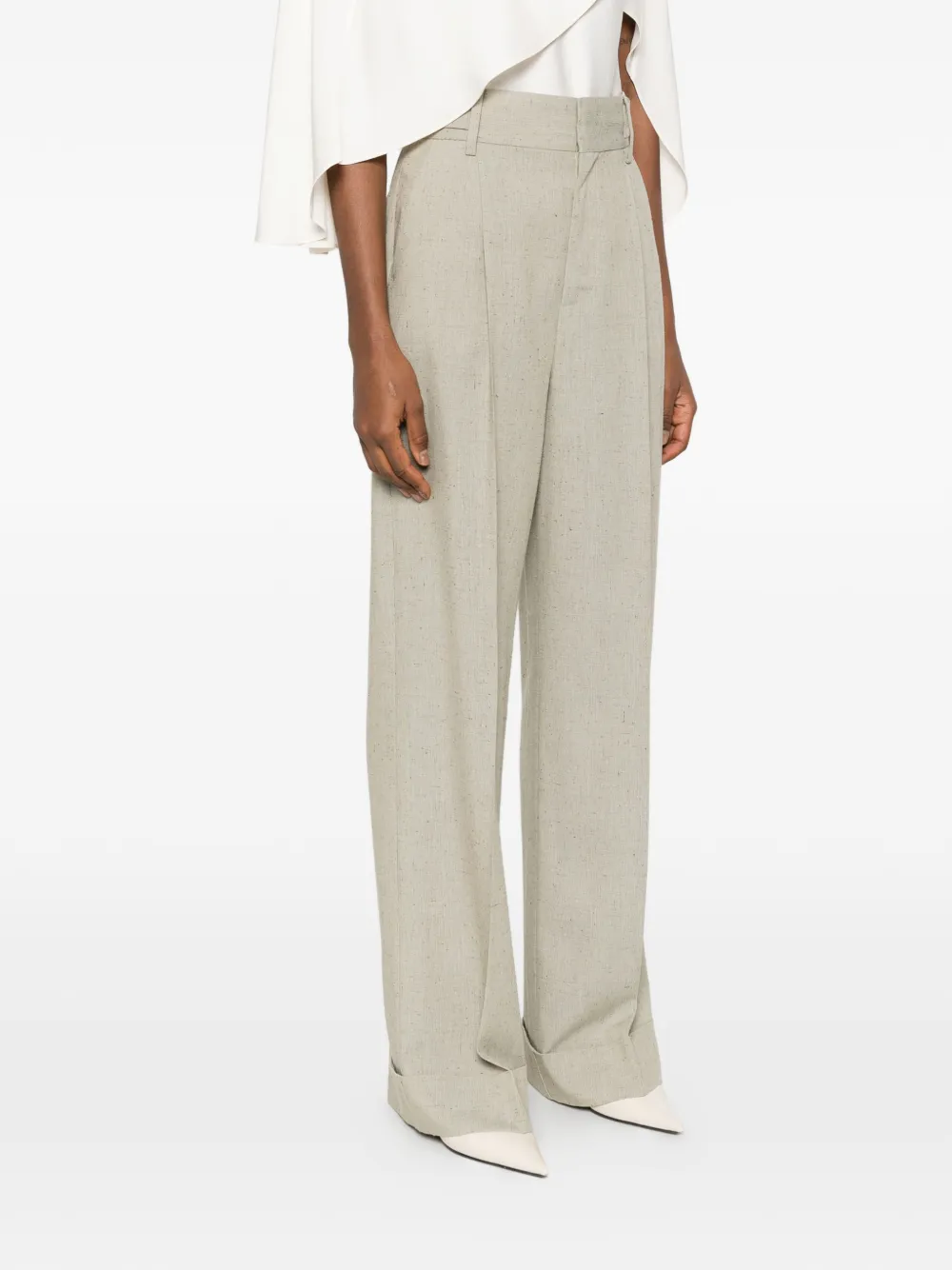 Бежевые складки, подвернутый край, шлевки для ремня, боковые карманы
