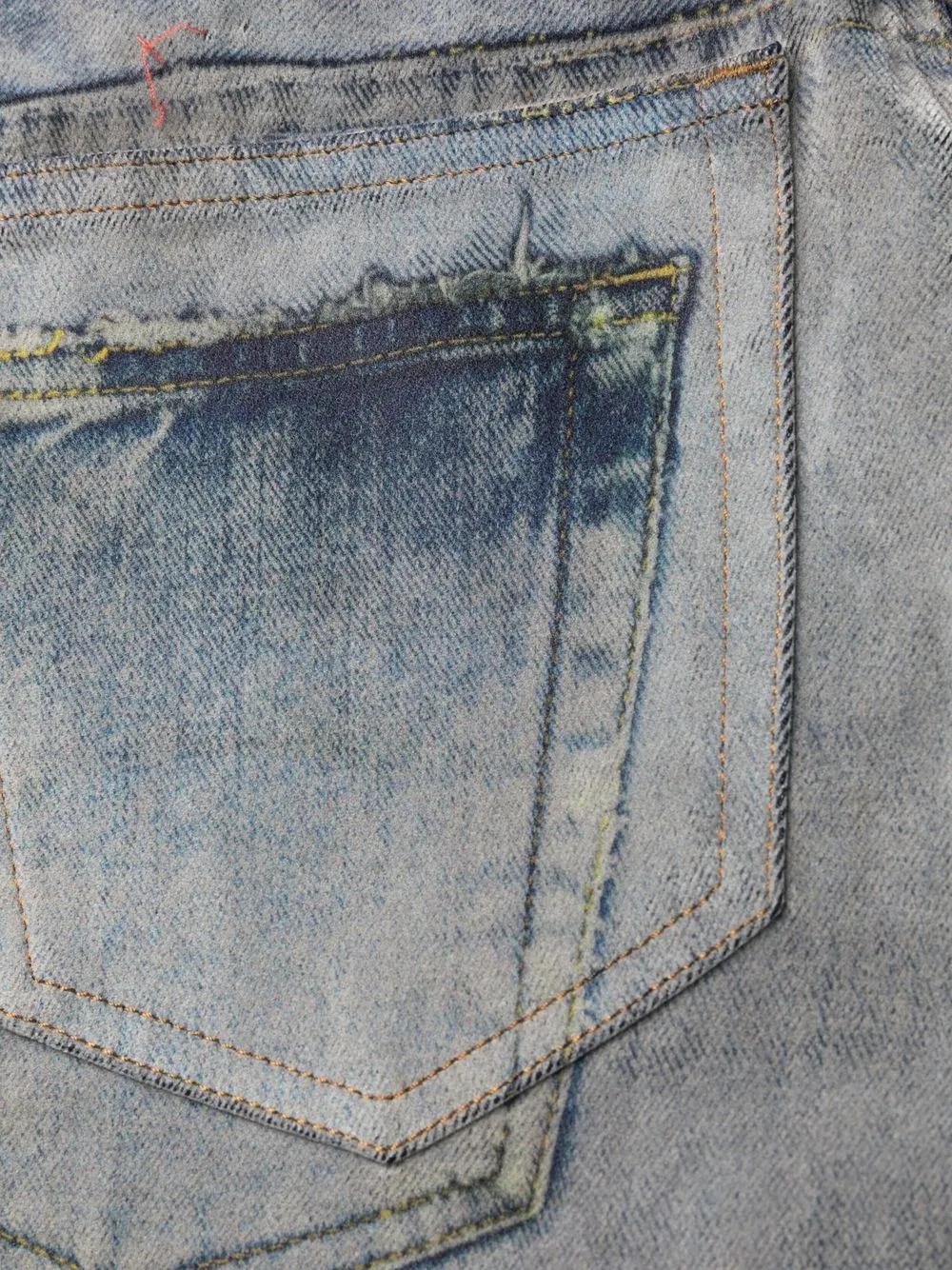 Синий, эластичный хлопок, обработанный деним, потайная застежка на молнии и пуговицах, петли для ремня, нашивка с логотипом спереди, нашивка с логотипом сзади, пять карманов и расклешенный крой.