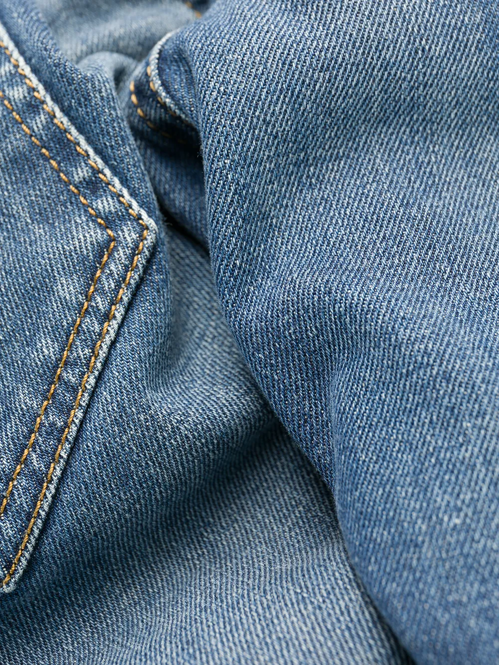 Средняя посадка, ширинка на пуговицах, петли для ремня, классическая пятикарманная модель, декоративные складки на бедрах, эффект потертости и зауженный крой. Цвет: синий.