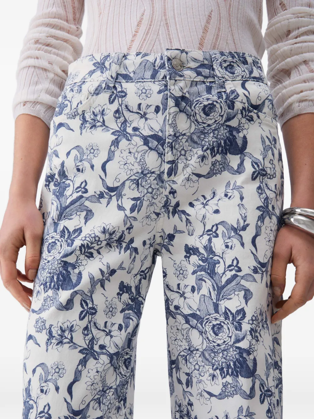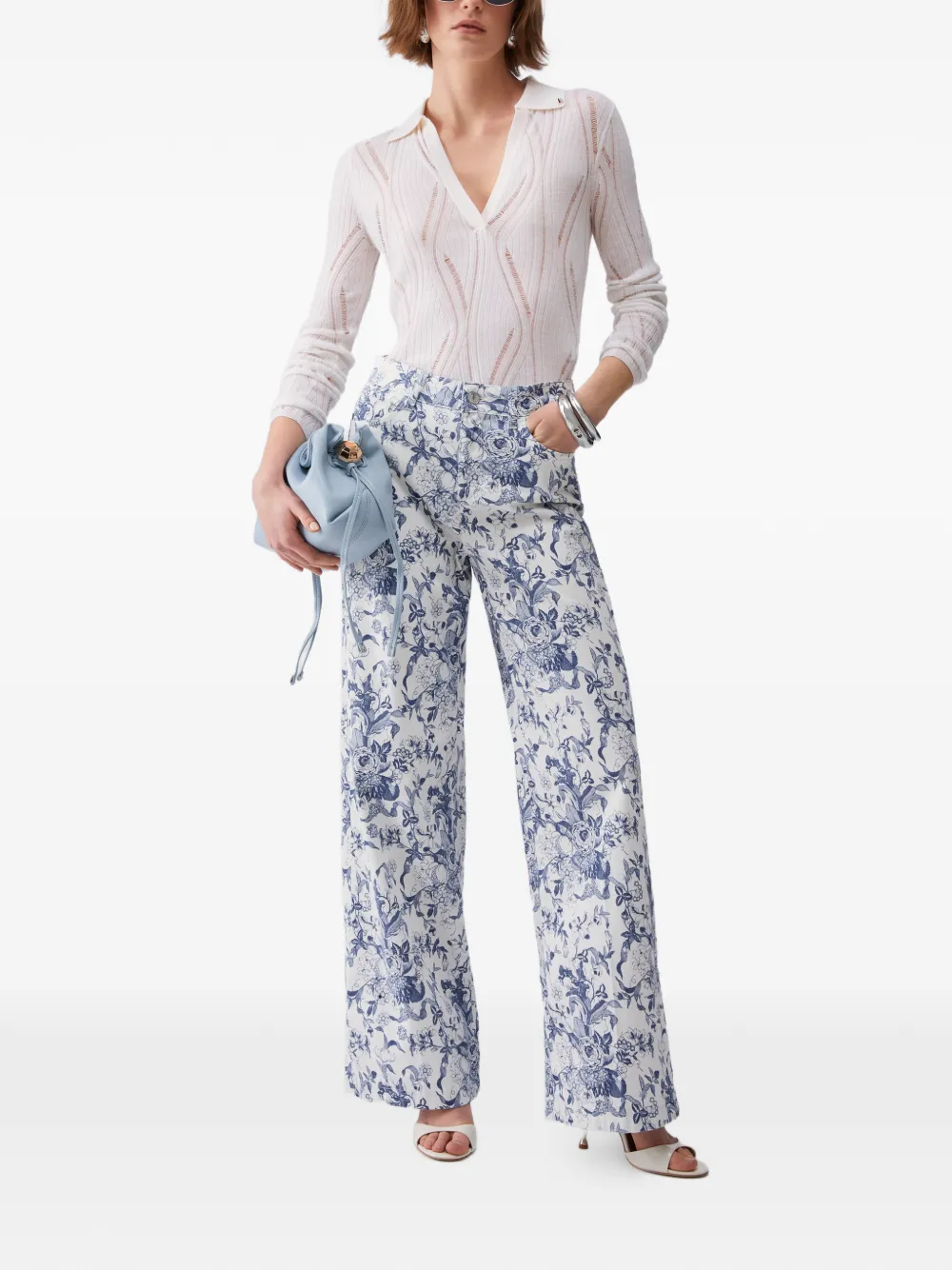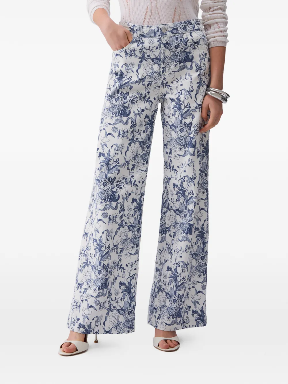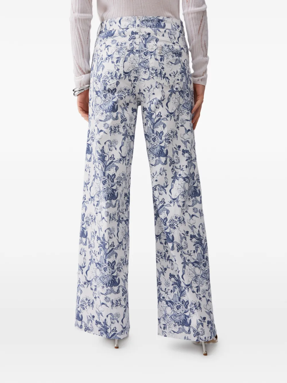 Белые и синие брюки с цветочным принтом, высокой посадкой, расклешенными штанинами, боковыми карманами и застежкой на молнию