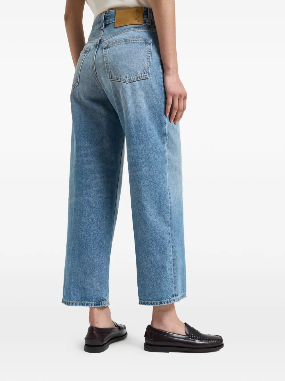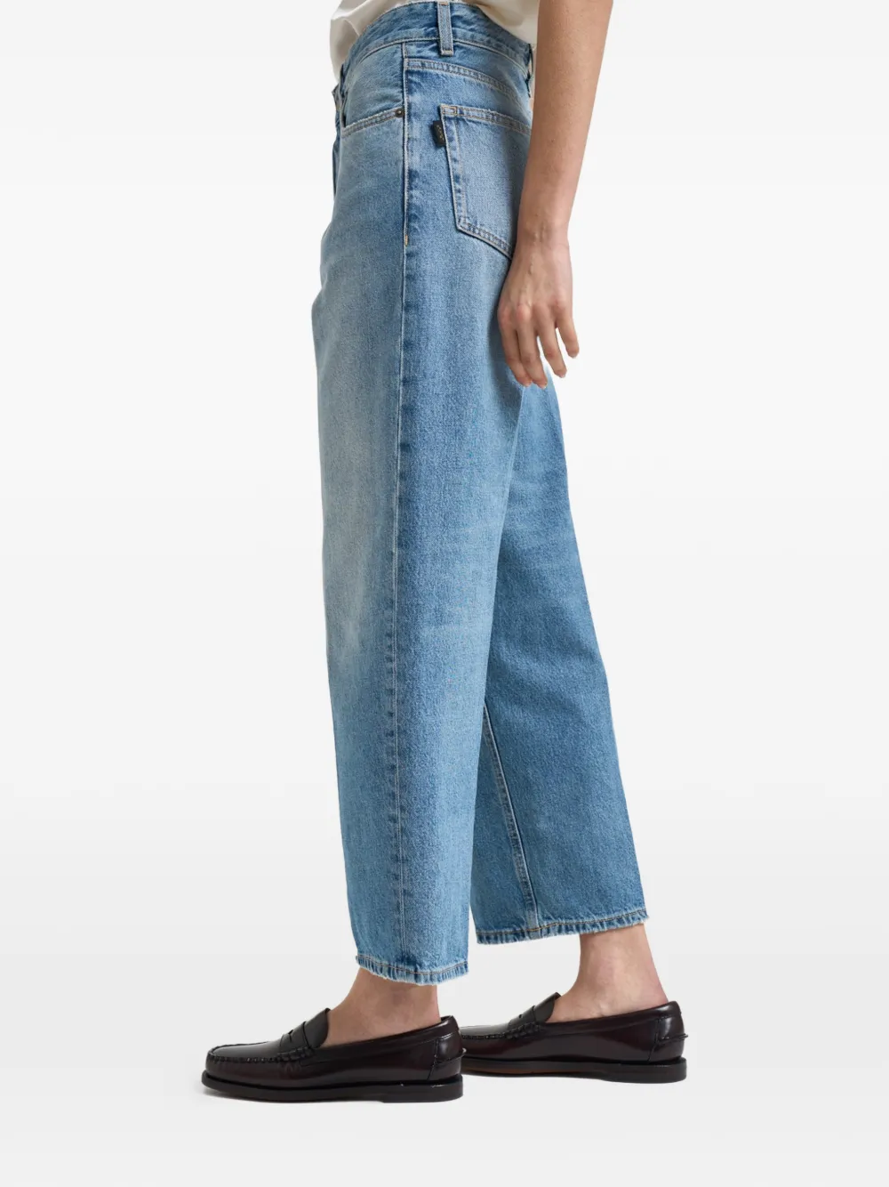Скандинавский синий, пять карманов, шлевки для ремня, застежка на пуговицы, прямые штанины, эффект потертостей