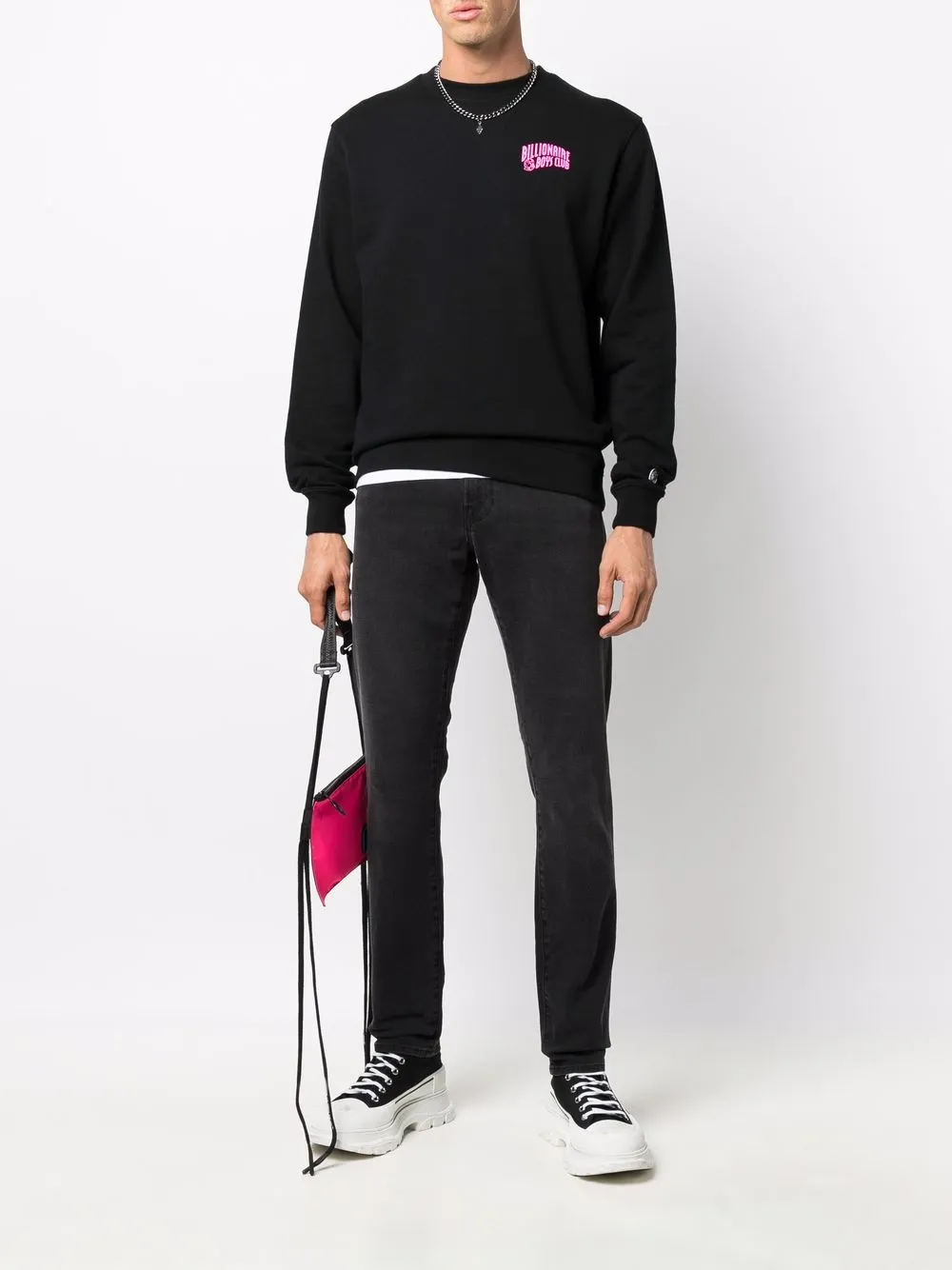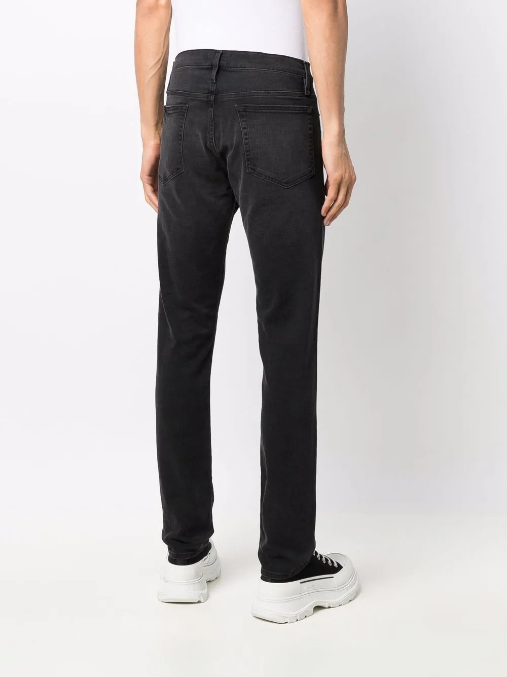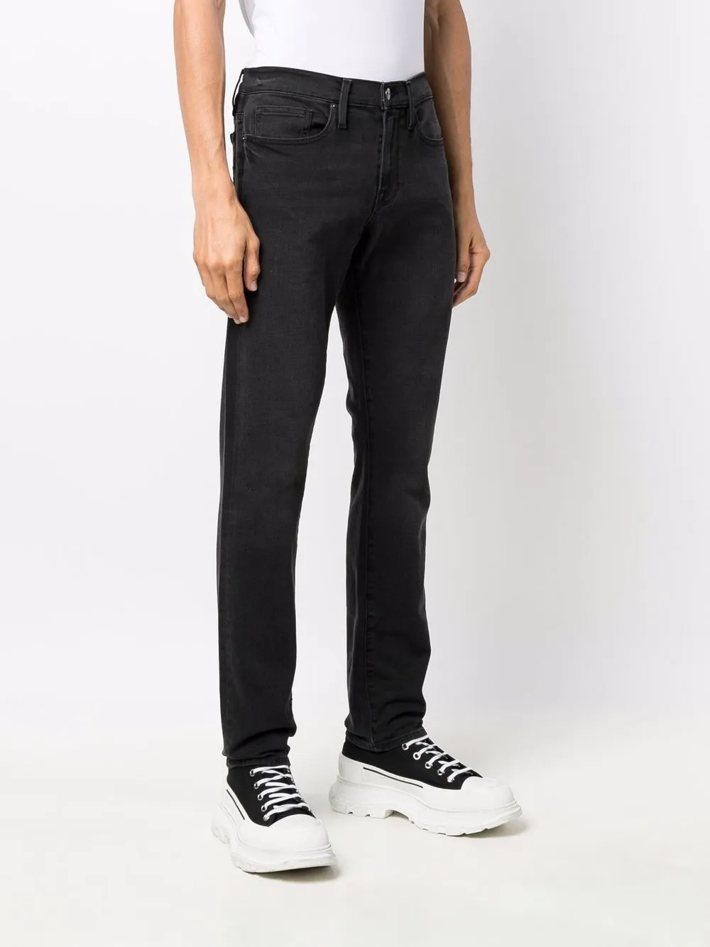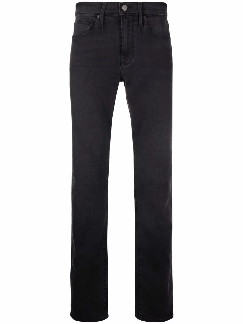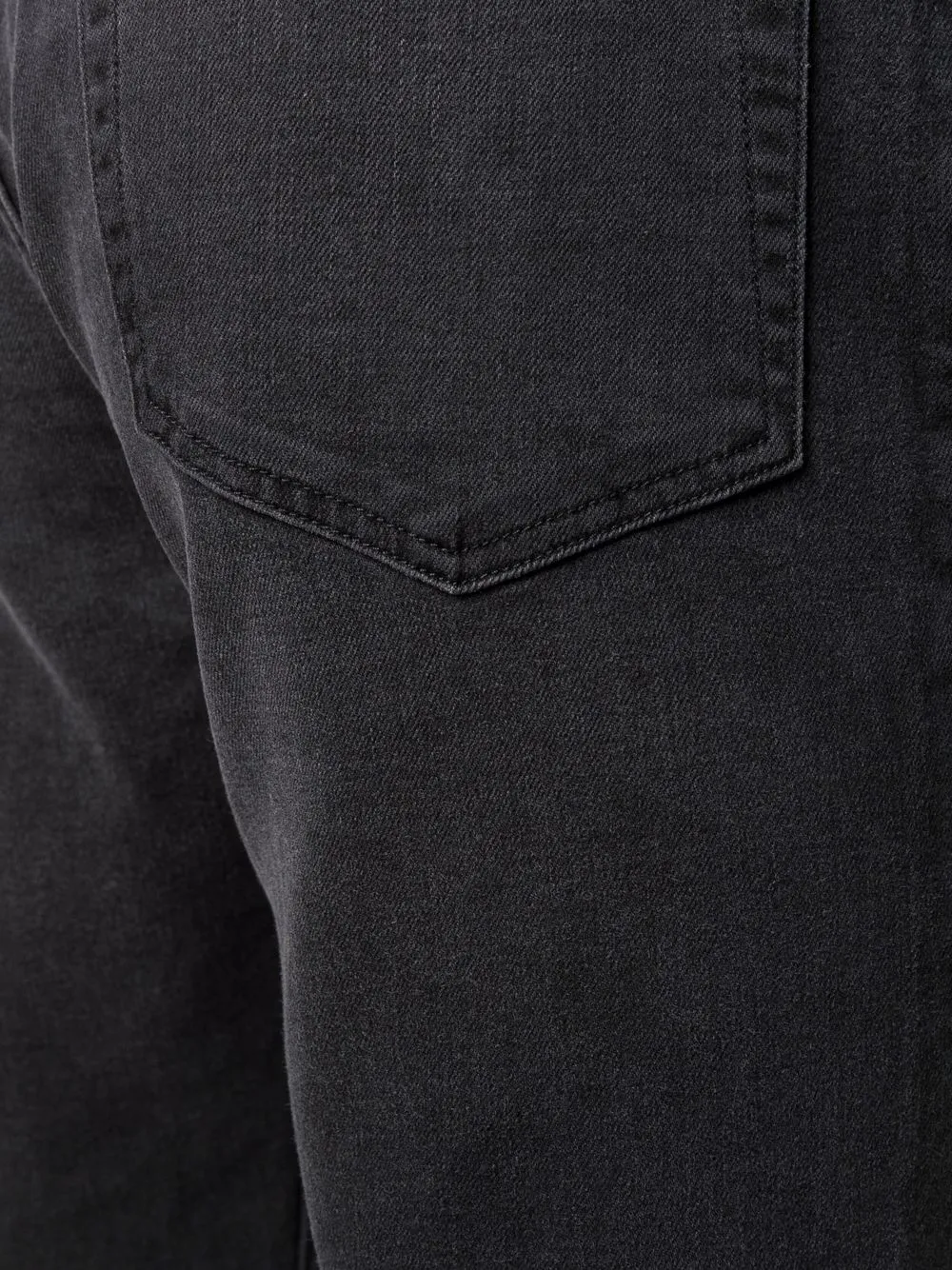 Узкий крой, петли для ремня, застежка на молнии и пуговице спереди и классическая пятикарманная модель.