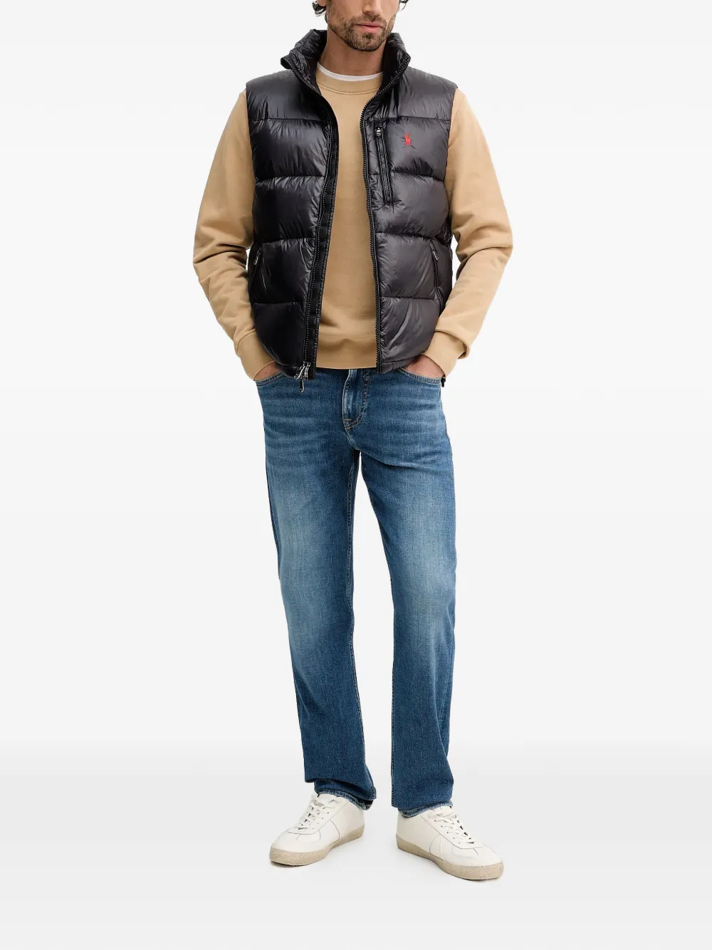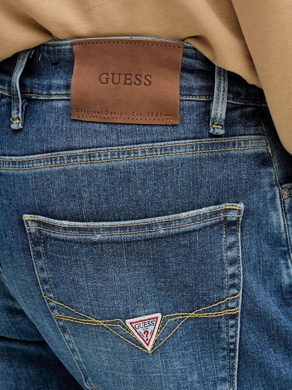 Синий патч сзади с логотипом, пять карманов, тональная строчка, прямые брючины, шлевки для ремня