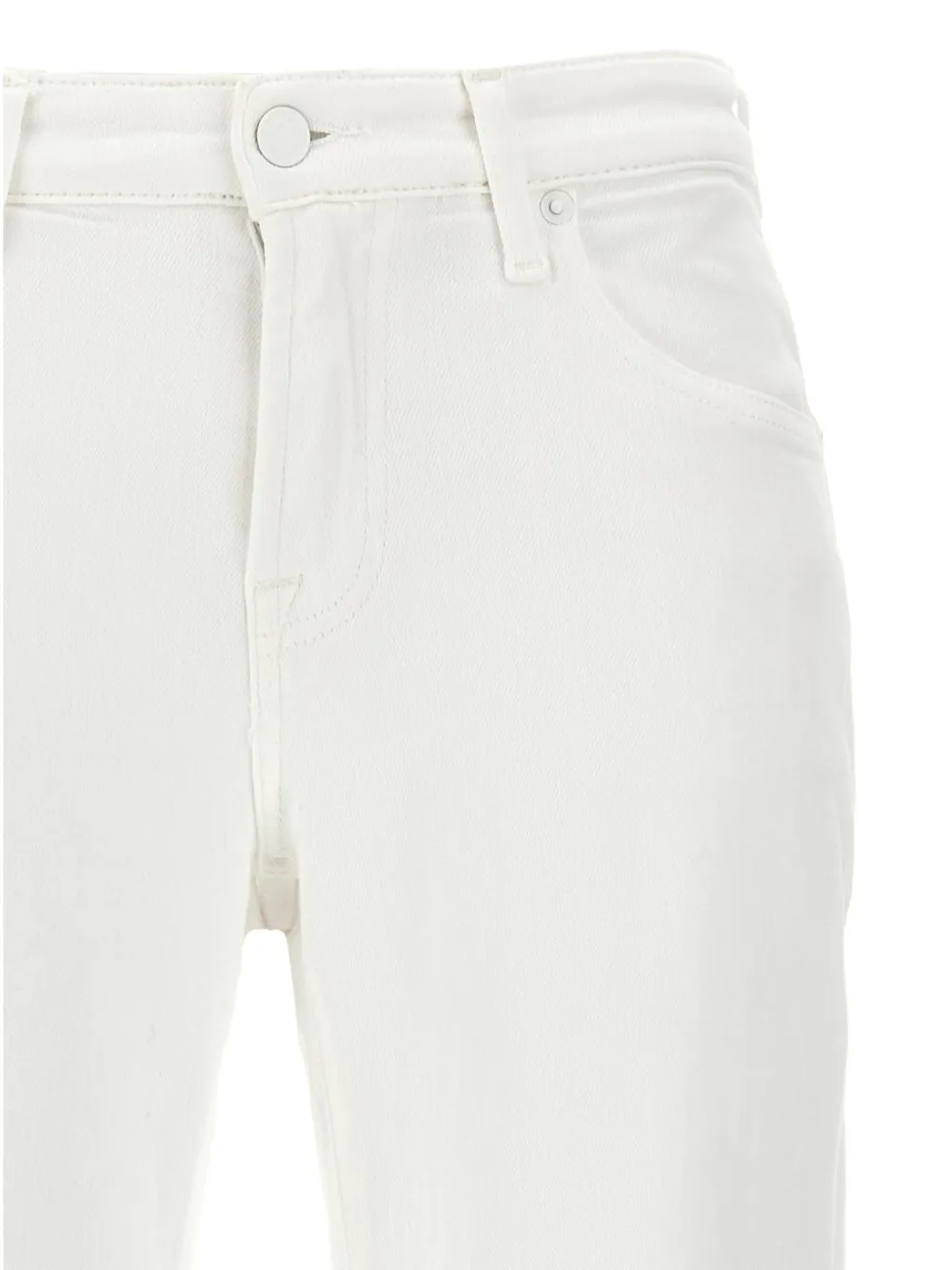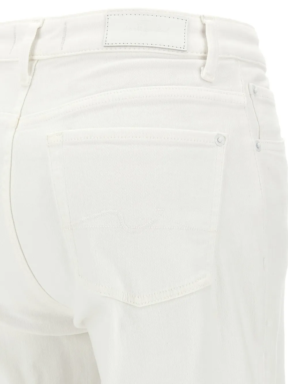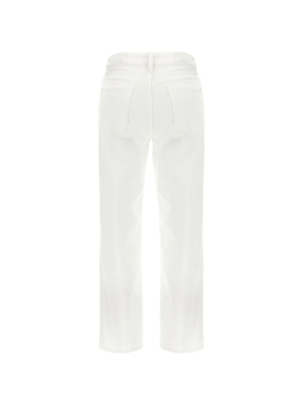 Белые задние карманы, шлевки для пояса, тональная строчка, застежка на пуговицу, прямые брючины