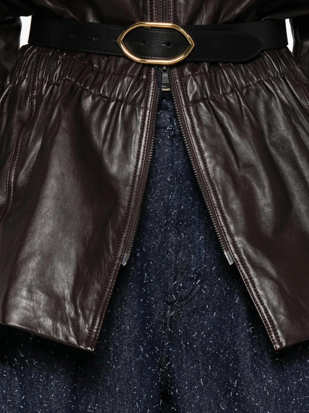 Синие джинсы с эффектом крапинок, широкими штанинами, завышенной талией и пятью карманами