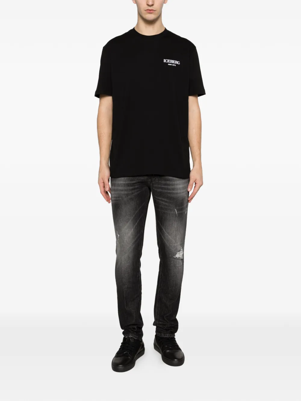Черный цвет с эффектом потертости, пять карманов, шлевки для ремня, тональная прострочка