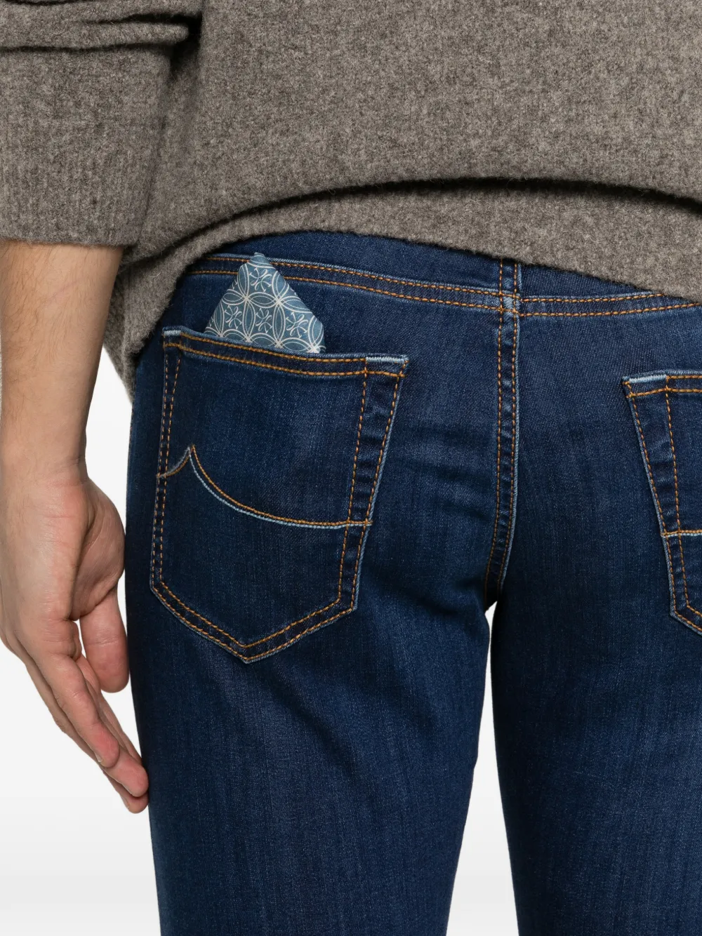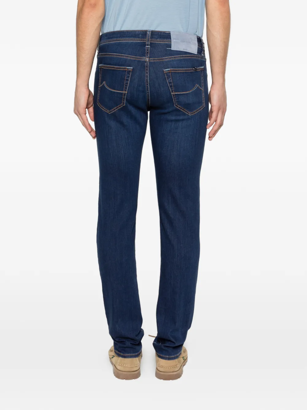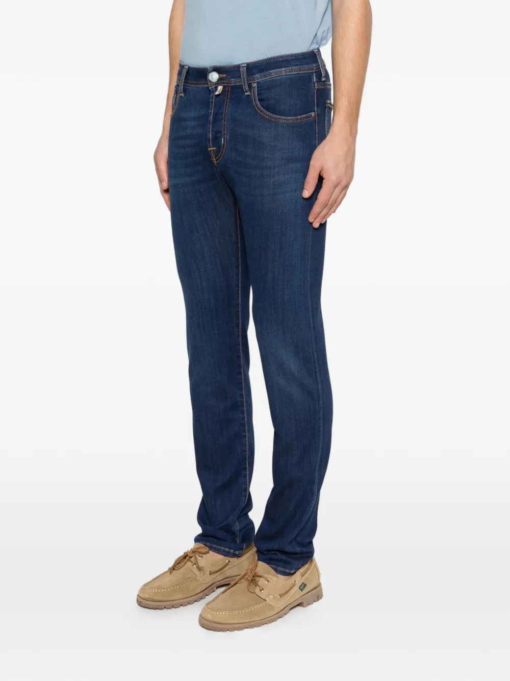 Темно-синий, тональная прострочка, пять карманов, шлевки для ремня, застежка на пуговицу
