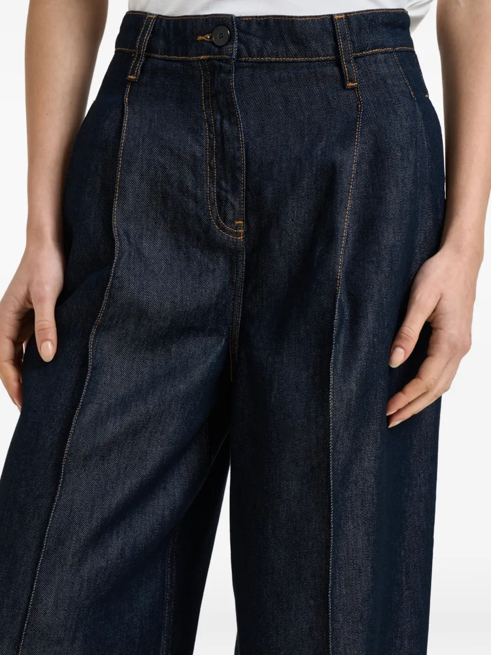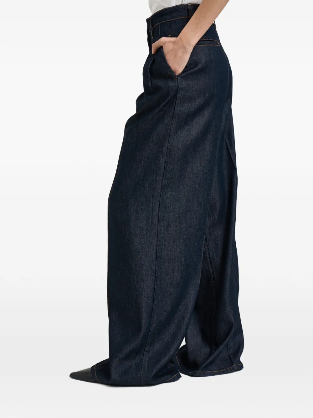Синие широкие брюки с защипами спереди, шлевками для ремня и прорезным карманом сзади