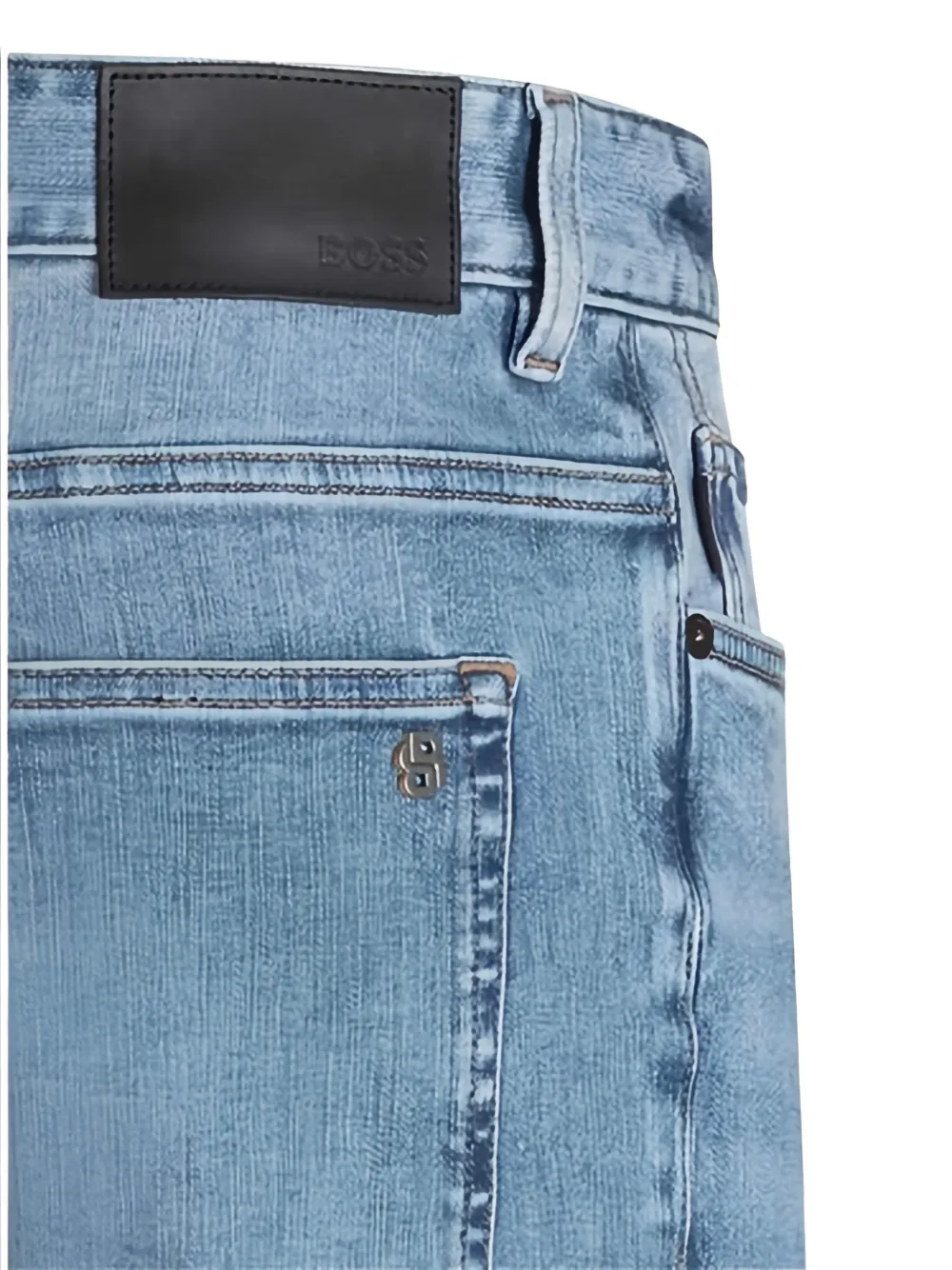 Светло-голубые джинсы с застежкой на пуговицы сзади, патчем и шлевками для ремня