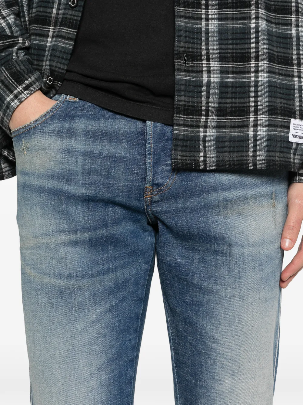 Синие прямые джинсы с пуговичной застежкой, пятью карманами и шлевками для ремня