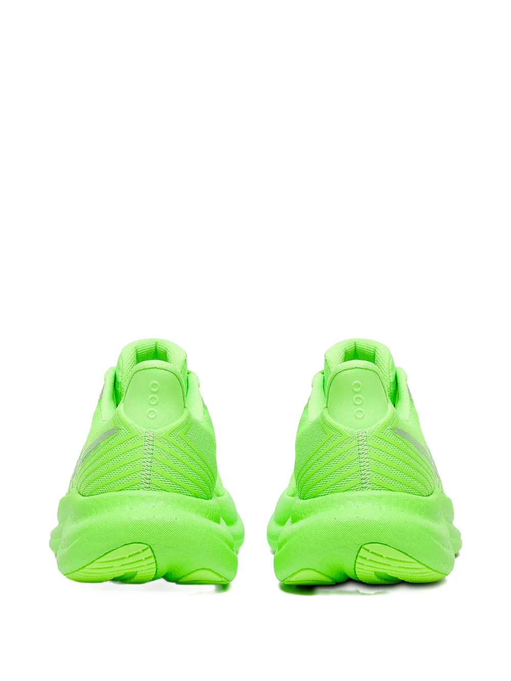 Зеленый цвет, серебристый логотип, шнуровка, верх из сетчатого материала, петля на пятке, резиновая подошва