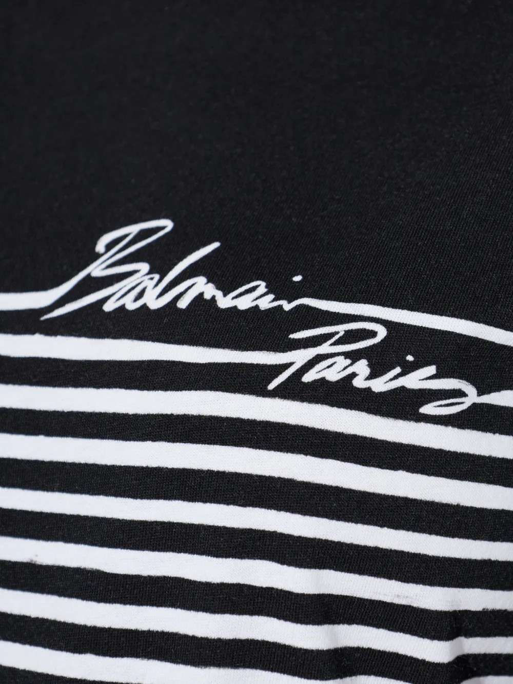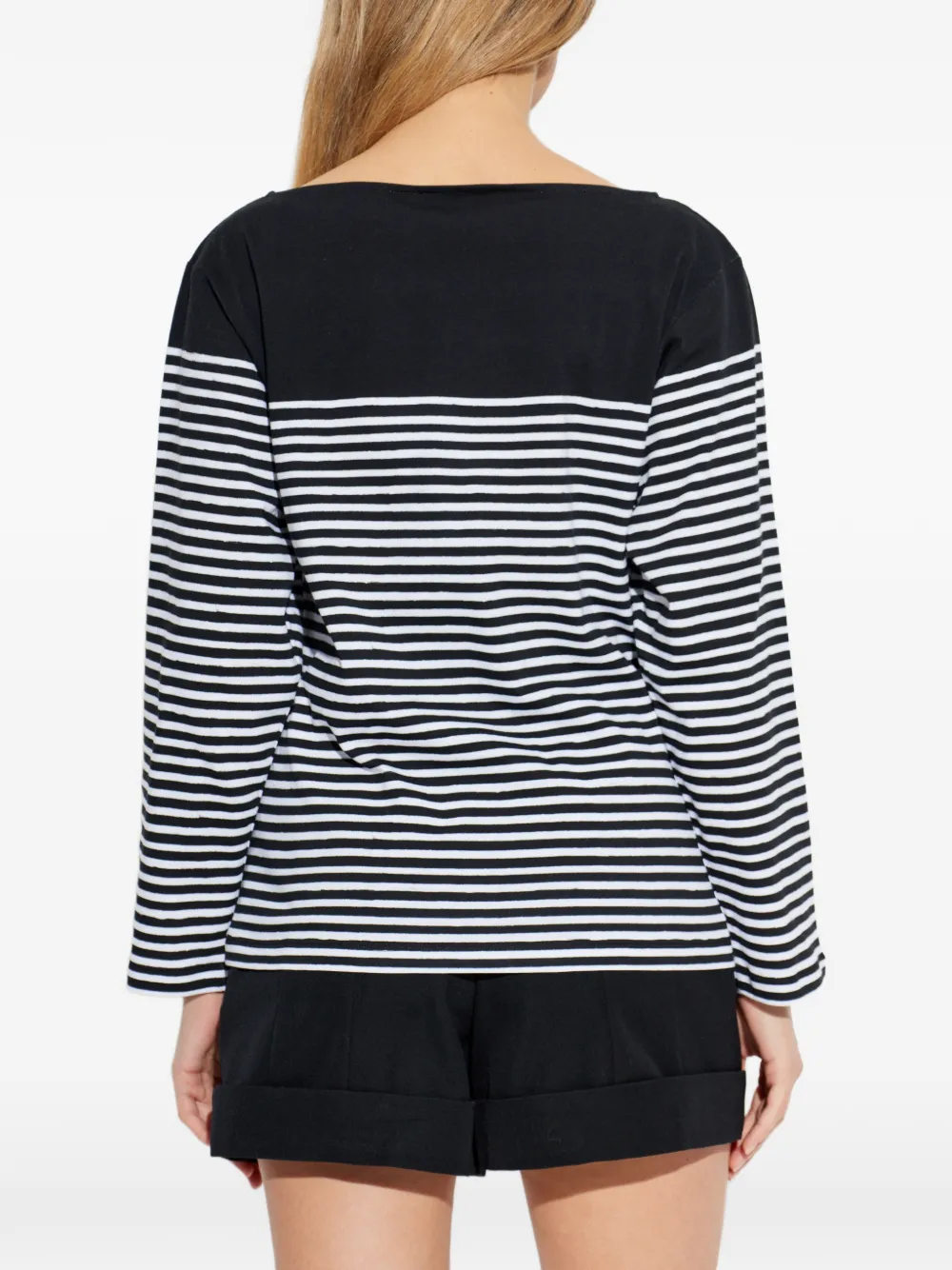 Черно-белая полосатая футболка с длинными рукавами, лодочкой и надписью