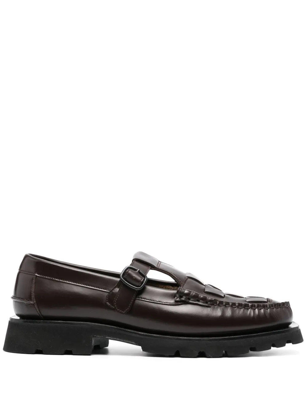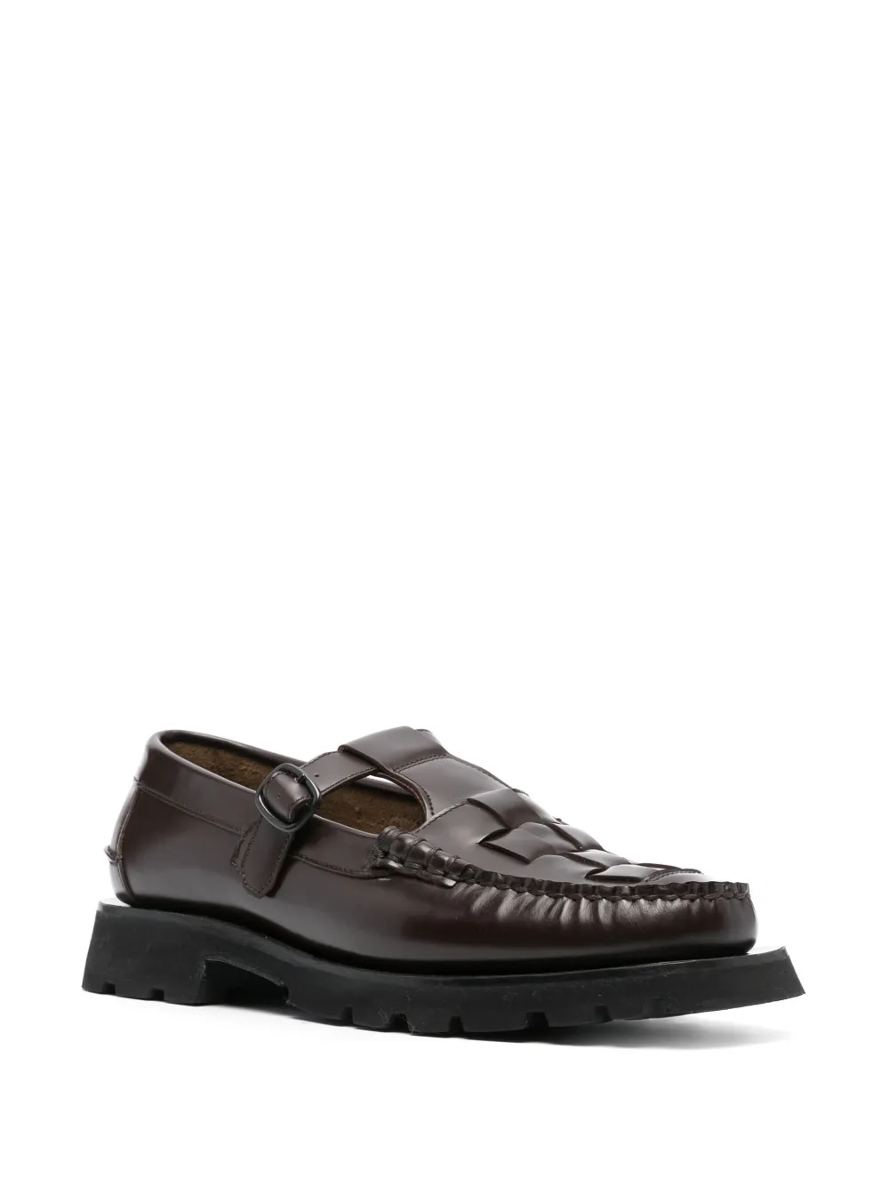 Телячья кожа, переплетенный дизайн, строчка в тон, квадратный носок, застежка на пряжке, кожаная стелька с логотипом и резиновая подошва.