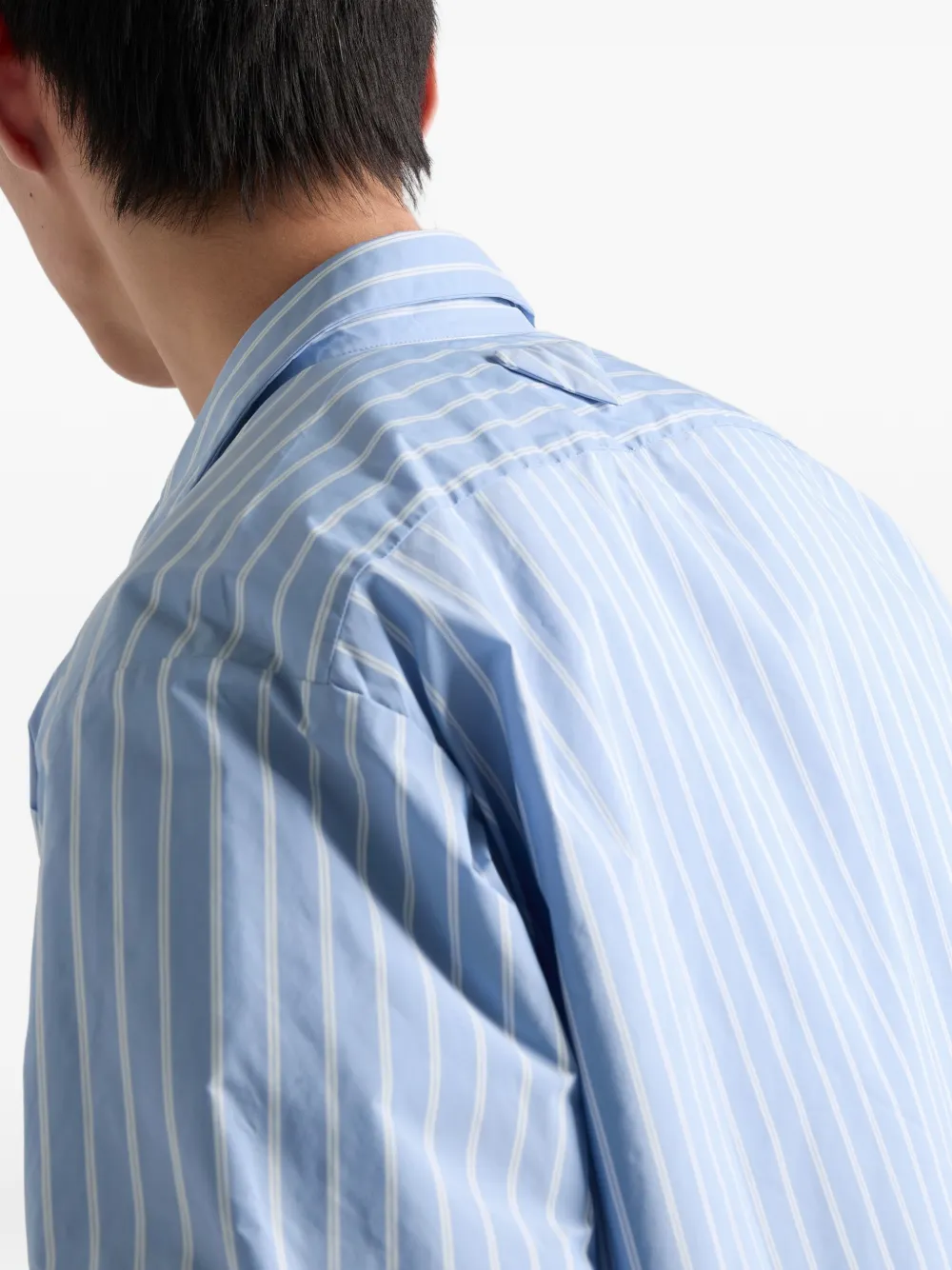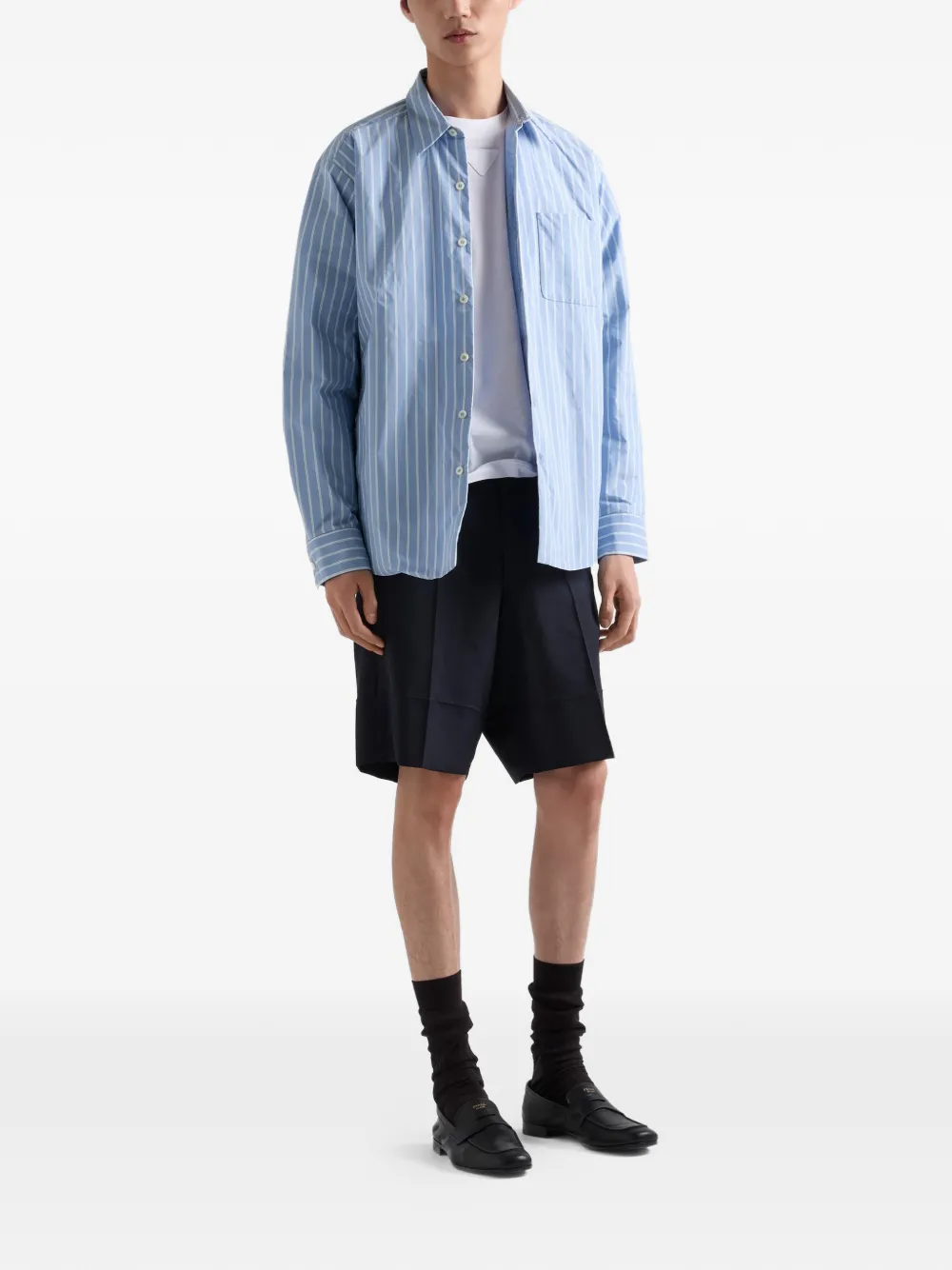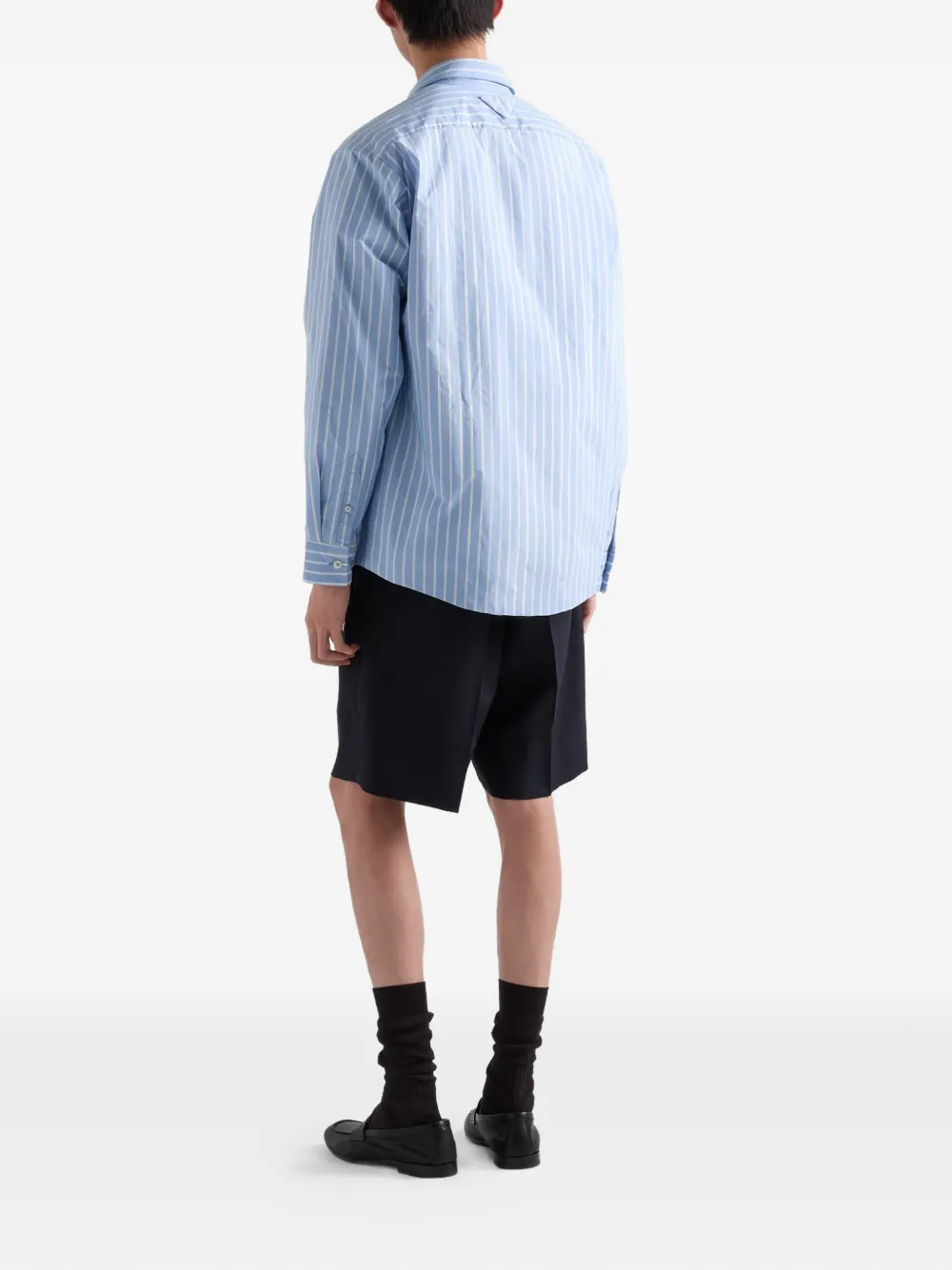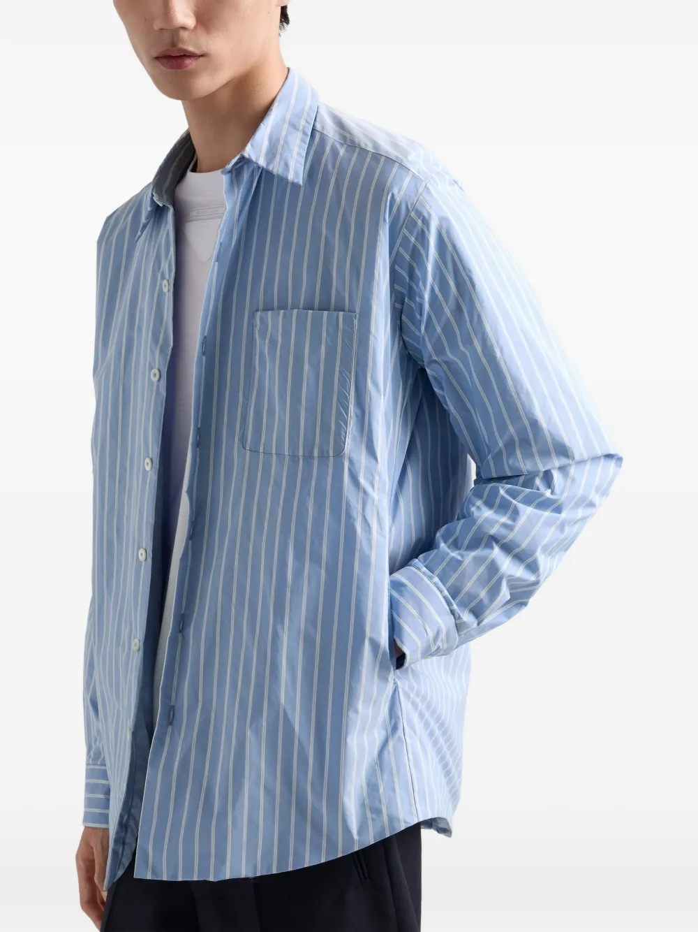Подробнее о товаре: Рубашка в классическом стиле выполнена из Re-Nylon, знаковой ткани Prada, объединяющей практичность, инновации и универсальность. Стиль выполнен в свободном крое с закругленным низом и украшен логотипом-треугольником в тон для характерного акцента. • свободный крой • классический воротник • маленький накладной карман • закругленный подол • перламутровые пуговицы • треугольный логотип сзади • джерси • эластичный материал