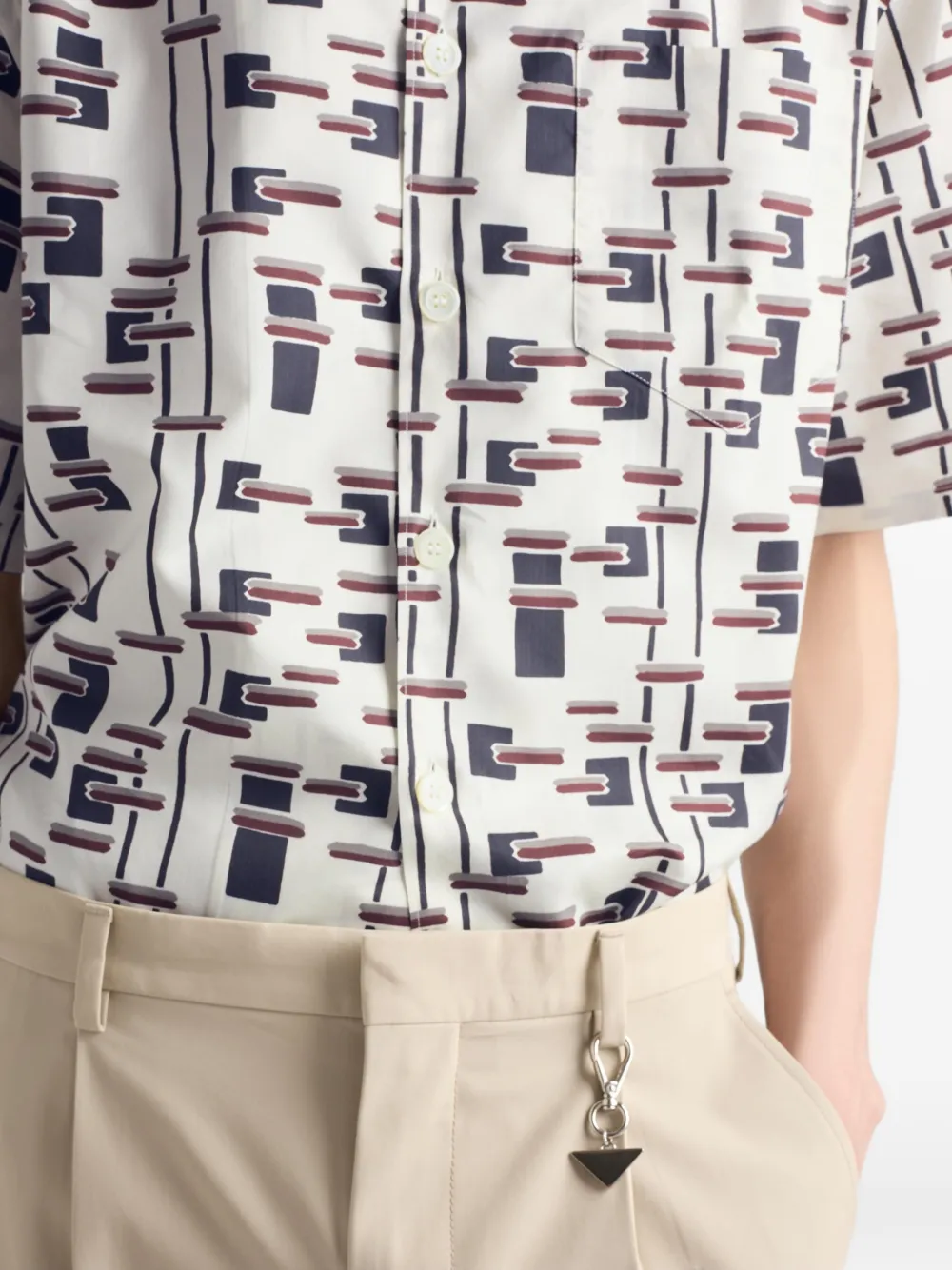 Рубашка с короткими рукавами сочетает современный принт и узнаваемый крой боулингового силуэта. Треугольный логотип добавляет яркую ноту одежде.