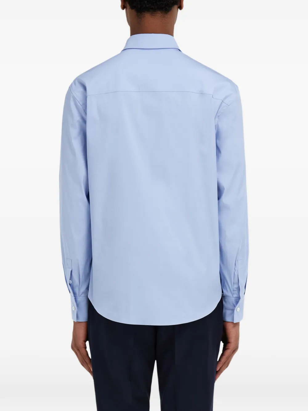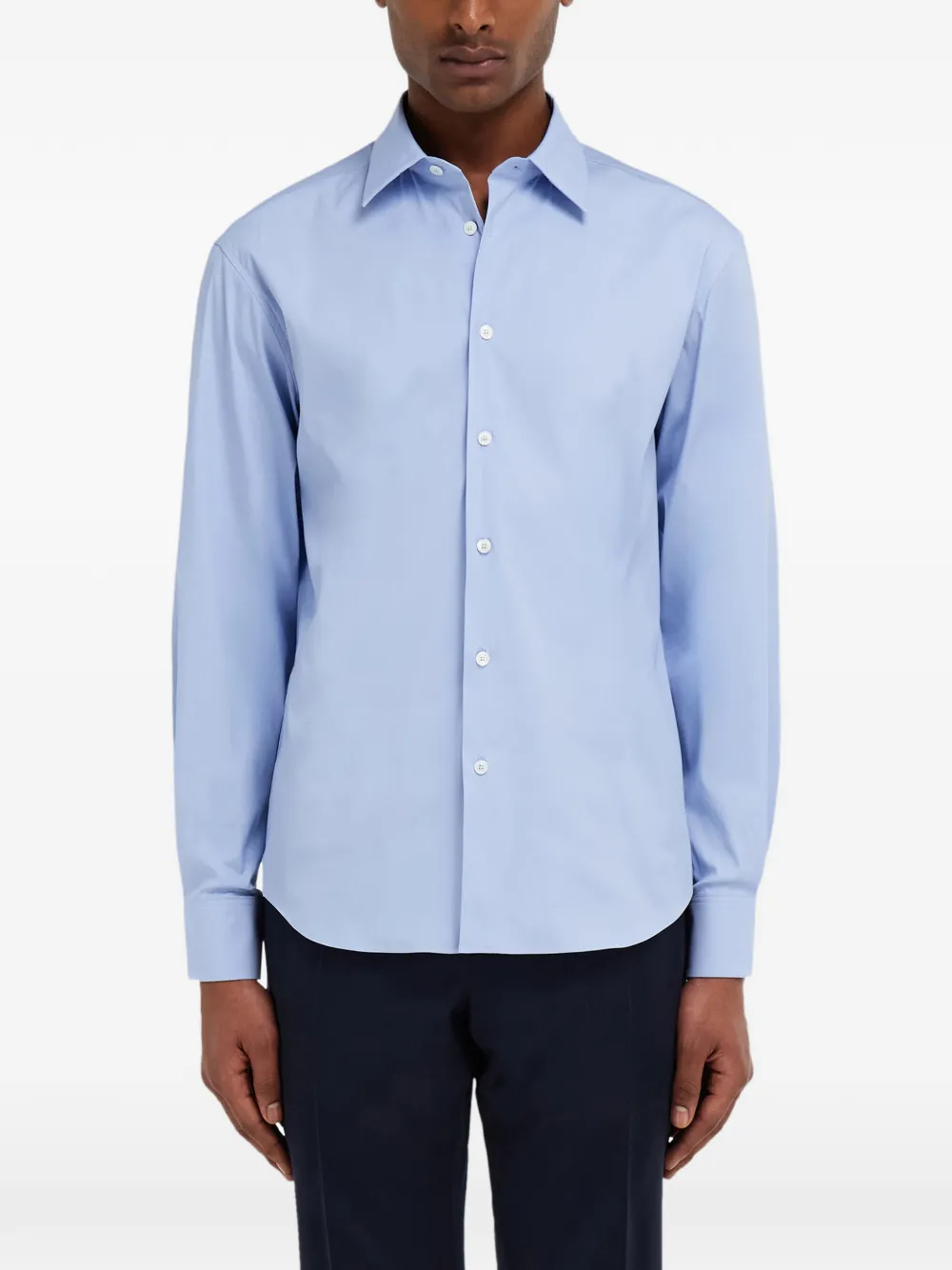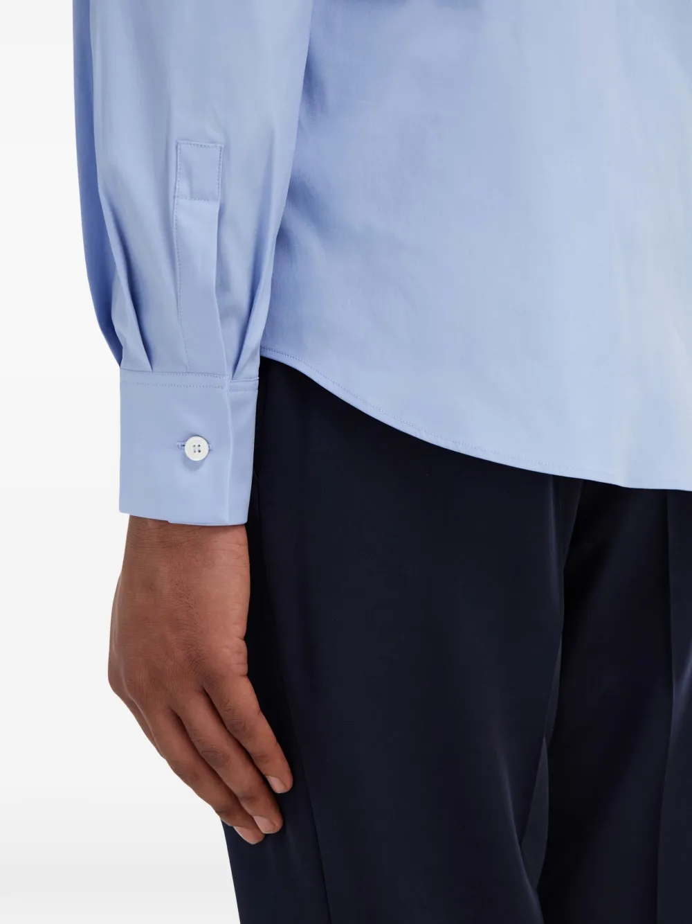 Рубашка из эластичного хлопкового поплина, украшенная элегантным микропринтом в стиле галстука. Классическая модель с прямым кроем, кокеткой на спине и закругленным подолом, застегивается на однотонные видимые пуговицы. Светло-оксфордовый синий цвет, длинные рукава.