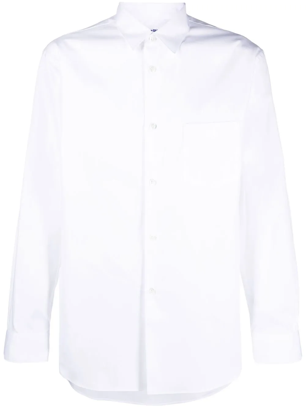 Белый, хлопок, поплин, классический воротник, застежка на пуговицах спереди, приспущенные плечи, длинные рукава, манжеты на пуговицах, закругленный подол и нагрудный накладной карман.