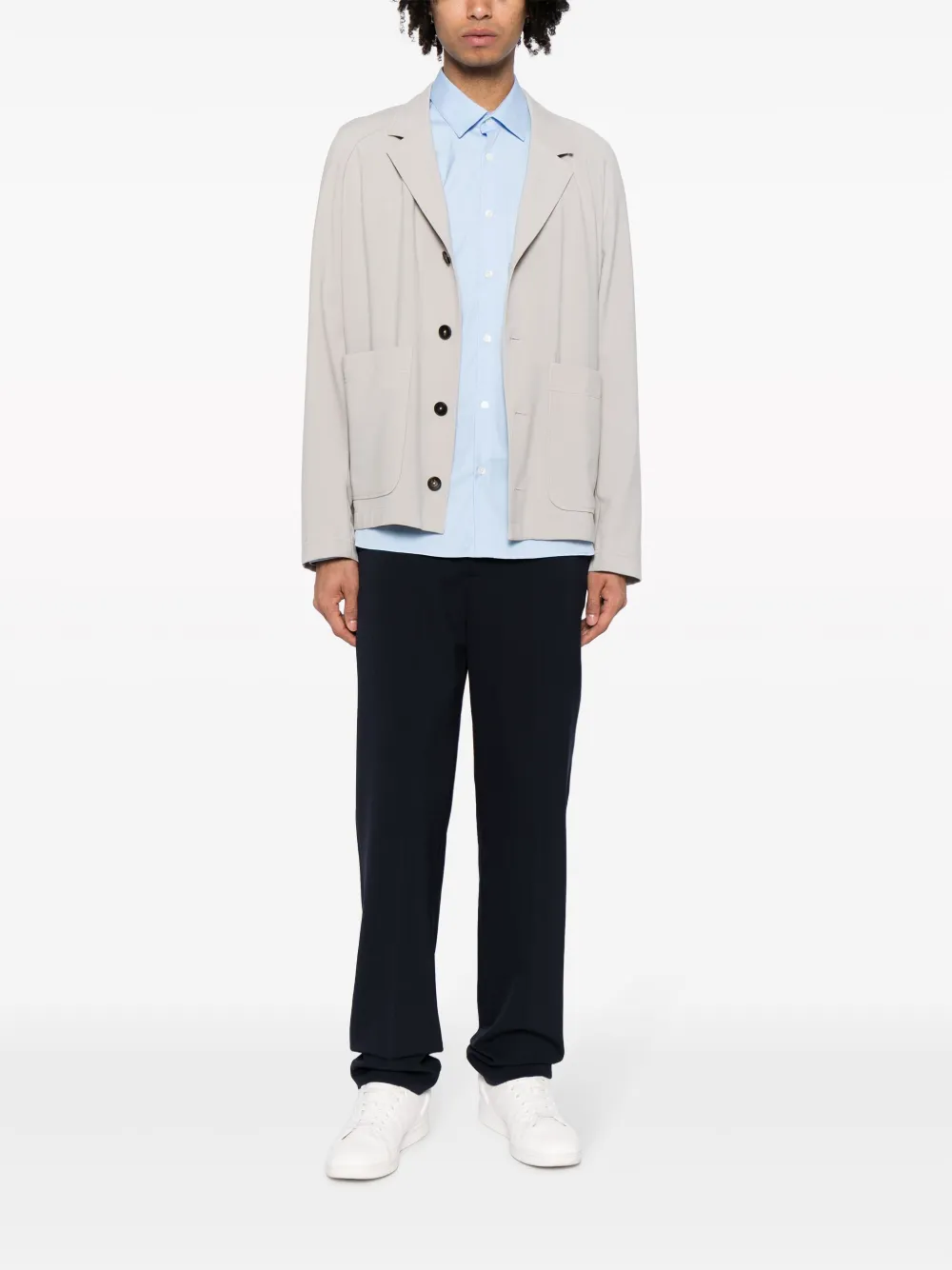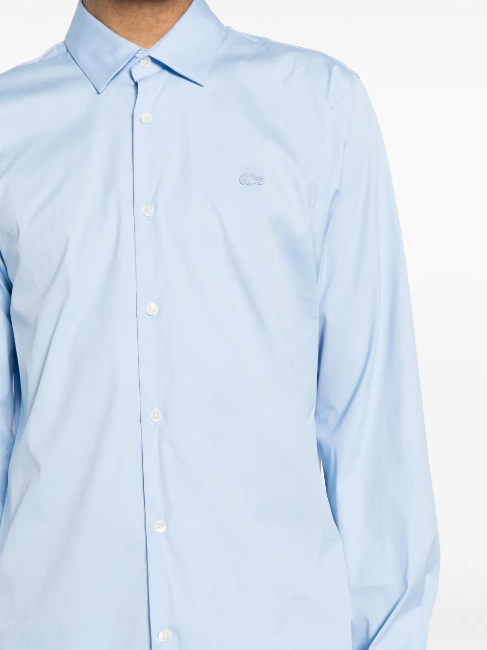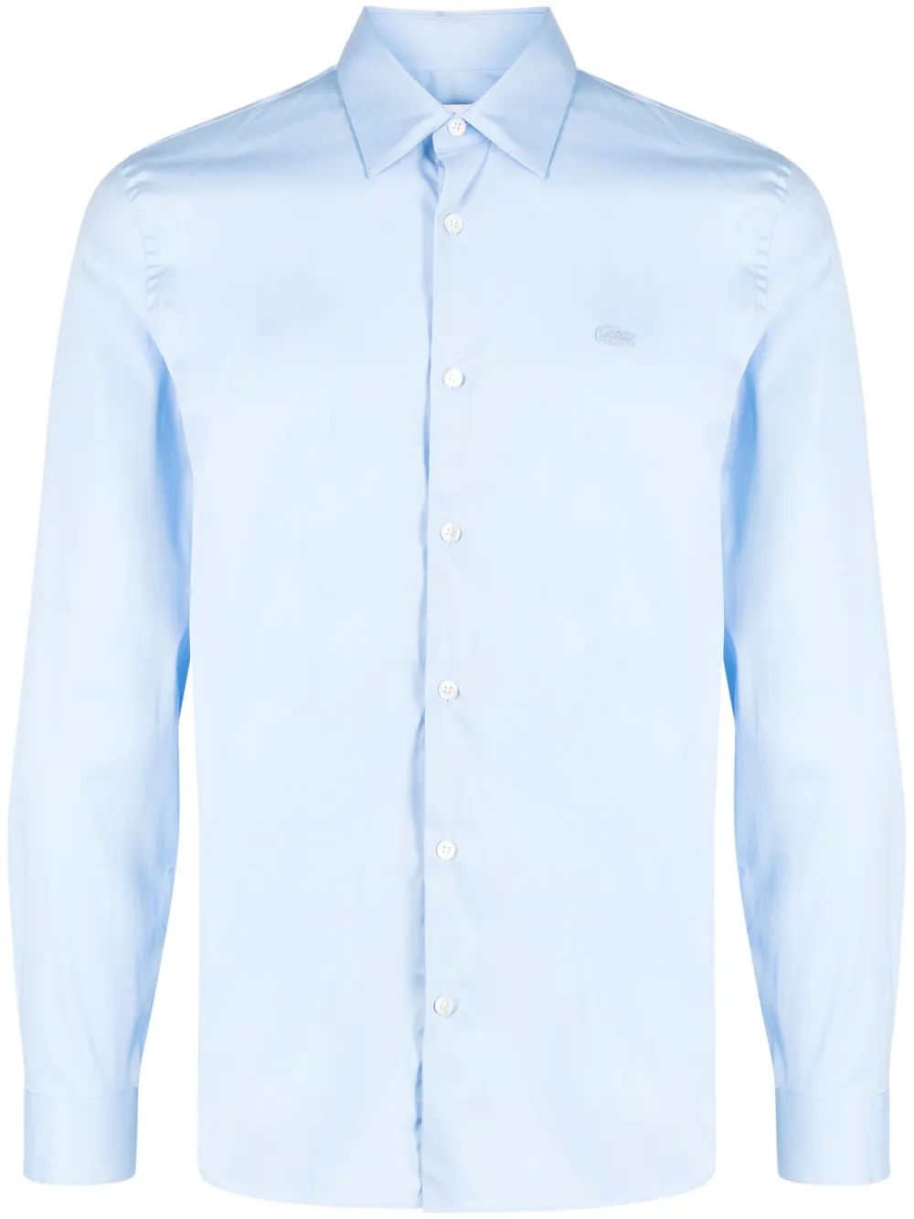 Нежно-голубой, смесовый хлопок, нашивка с логотипом на груди, классический воротник, застежка на пуговицах спереди, длинные рукава, манжеты на пуговицах и прямой подол.