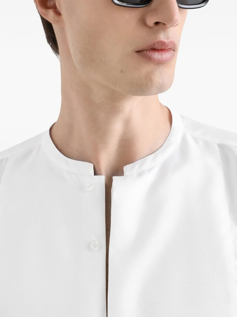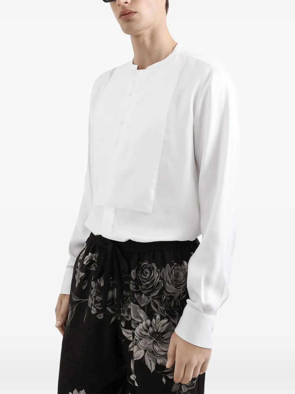 Рубашка из шелкового твила: белая, воротник-стойка «Мартини» без пуговицы, с плаштронной вставкой, длинные рукава, скошенные манжеты, произведено в Италии