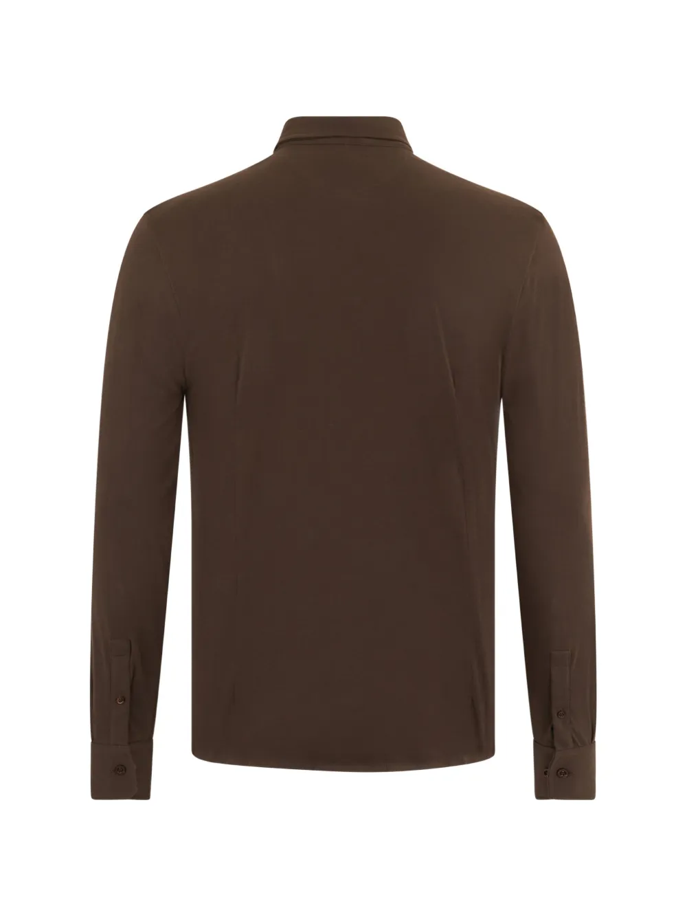Коричневая рубашка с накладным карманом на груди, застежкой на пуговицы, длинными рукавами, манжетами на пуговицах и классическим воротником