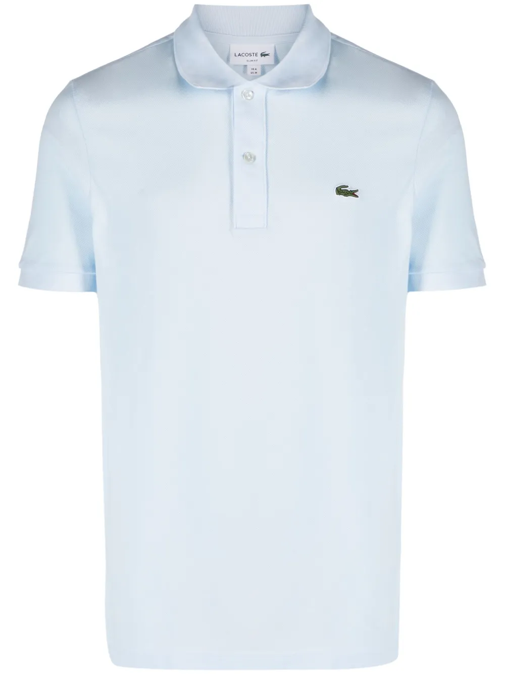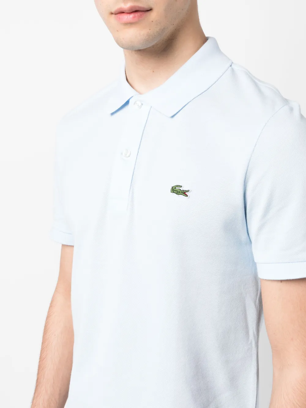 Нежно-голубой, хлопок, нашивка с логотипом на груди, воротник поло, планка на пуговицах спереди, короткие рукава и прямой подол.