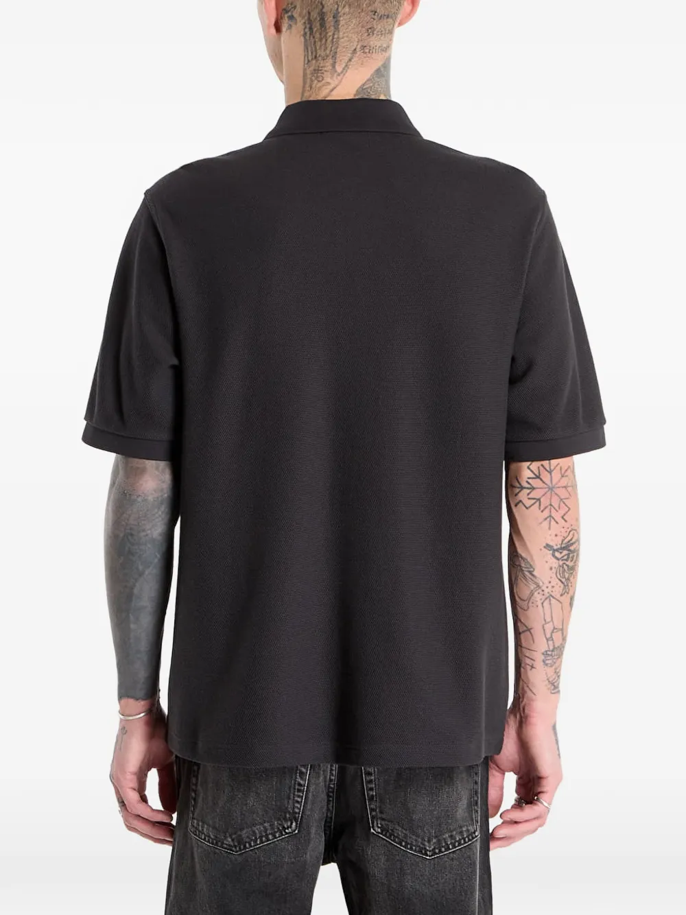 Темно-серая рубашка с вертикальным полосатым узором, застежкой на пуговицы спереди, короткими рукавами и вышитым логотипом