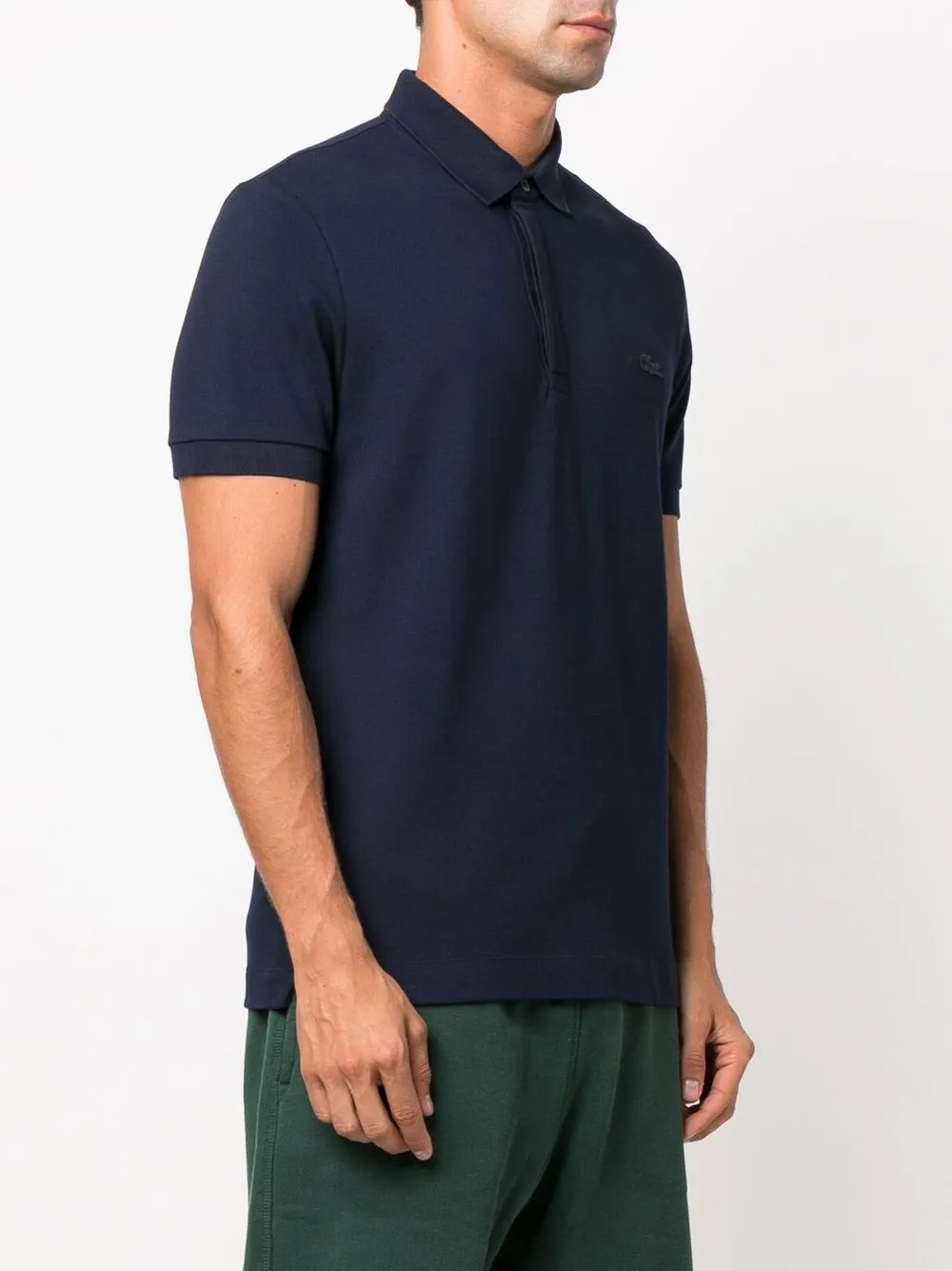 Темно-синий, эластичный хлопок, нашивка с логотипом спереди, воротник поло, планка на пуговицах спереди и короткие рукава.