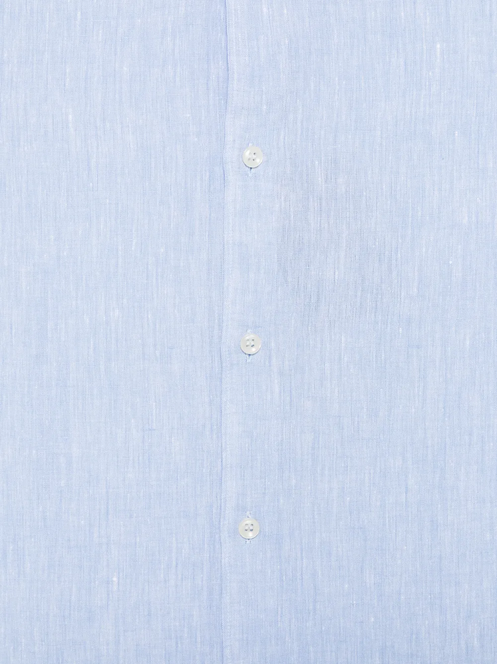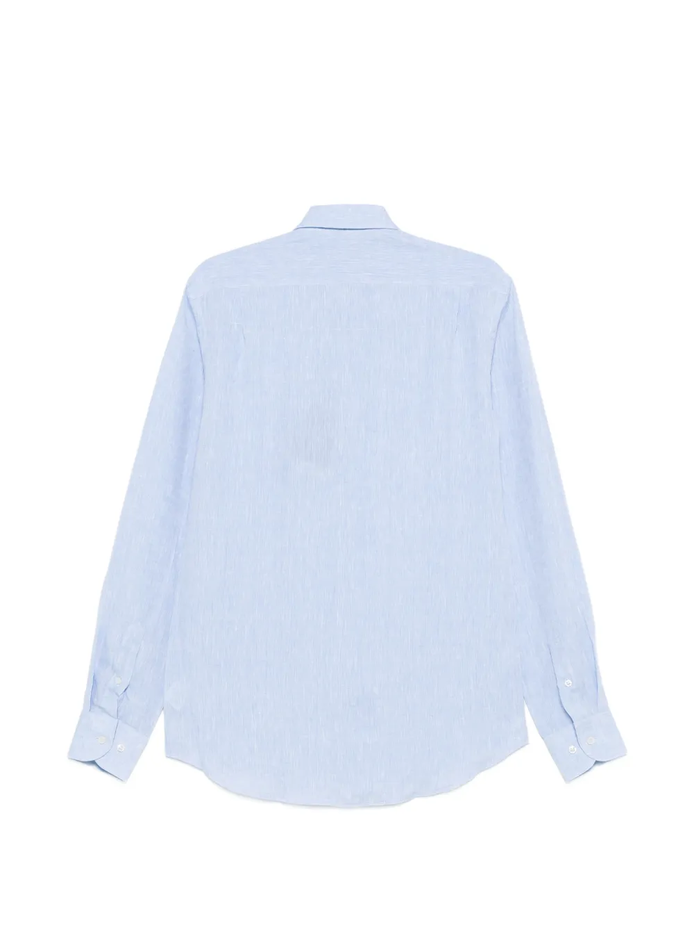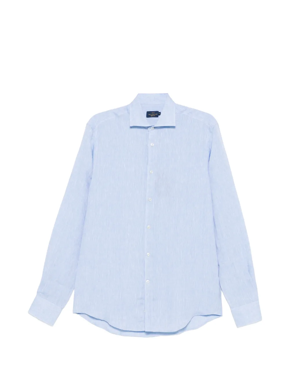 Светло-голубая рубашка на пуговицах, с длинными рукавами, классическим воротником, прямого кроя и закругленным подолом