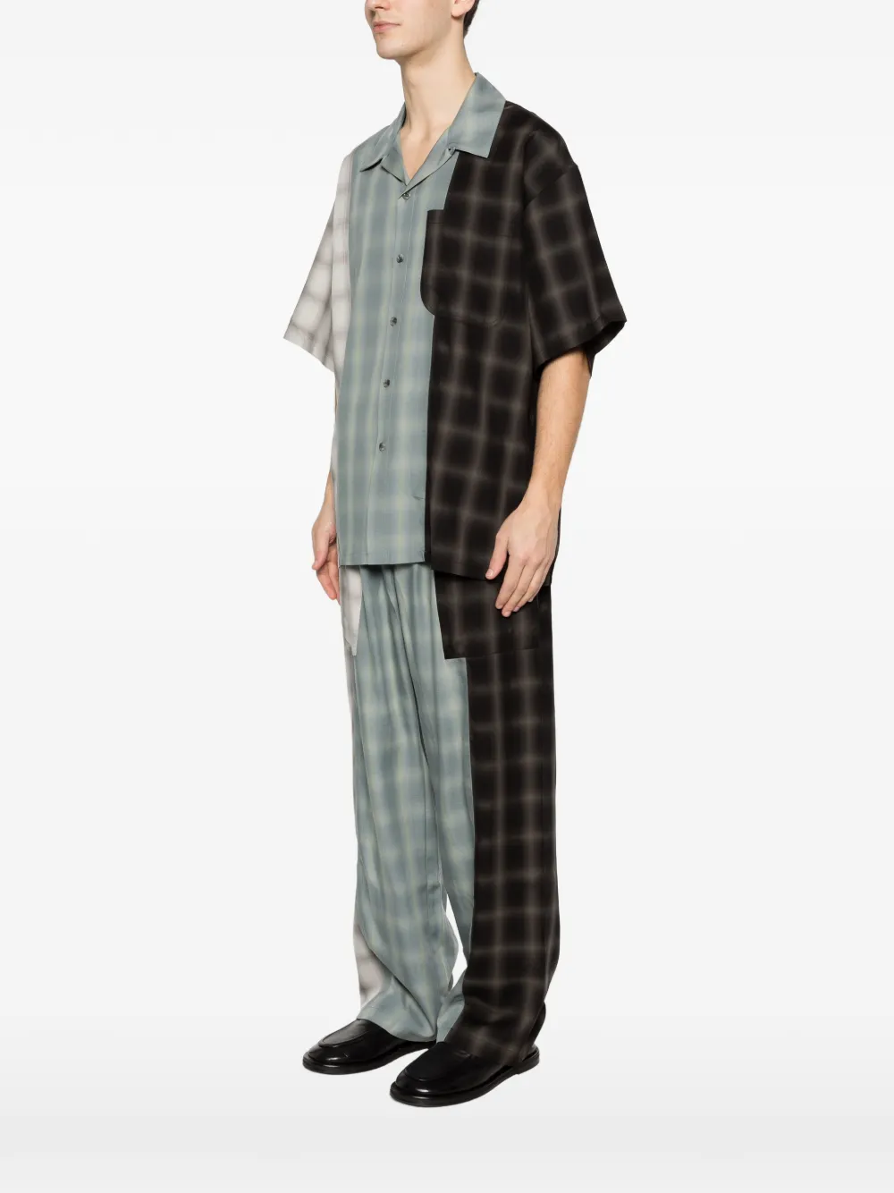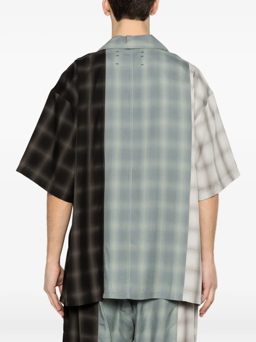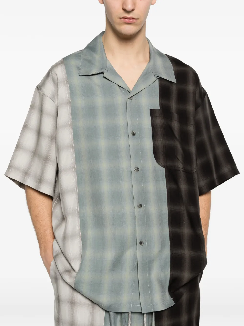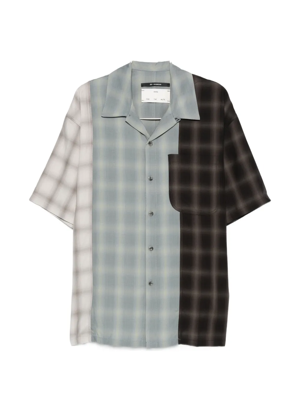 Синий и разноцветный клетчатый узор, отложной воротник-«кемп», нагрудный карман, короткие рукава, застежка на пуговицы