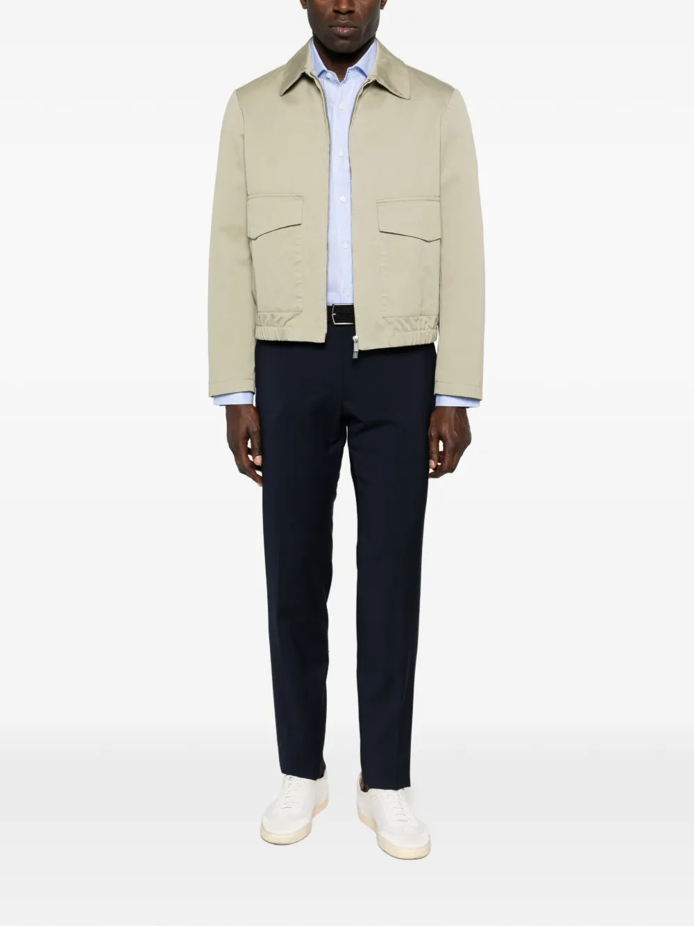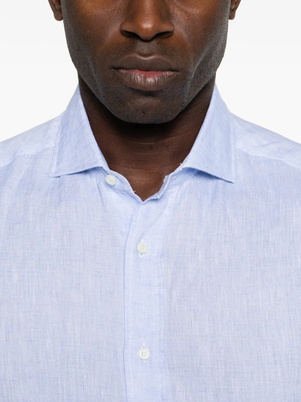Светло-голубая рубашка с застежкой на пуговицы, длинными рукавами, отложным воротником и манжетами на пуговицах