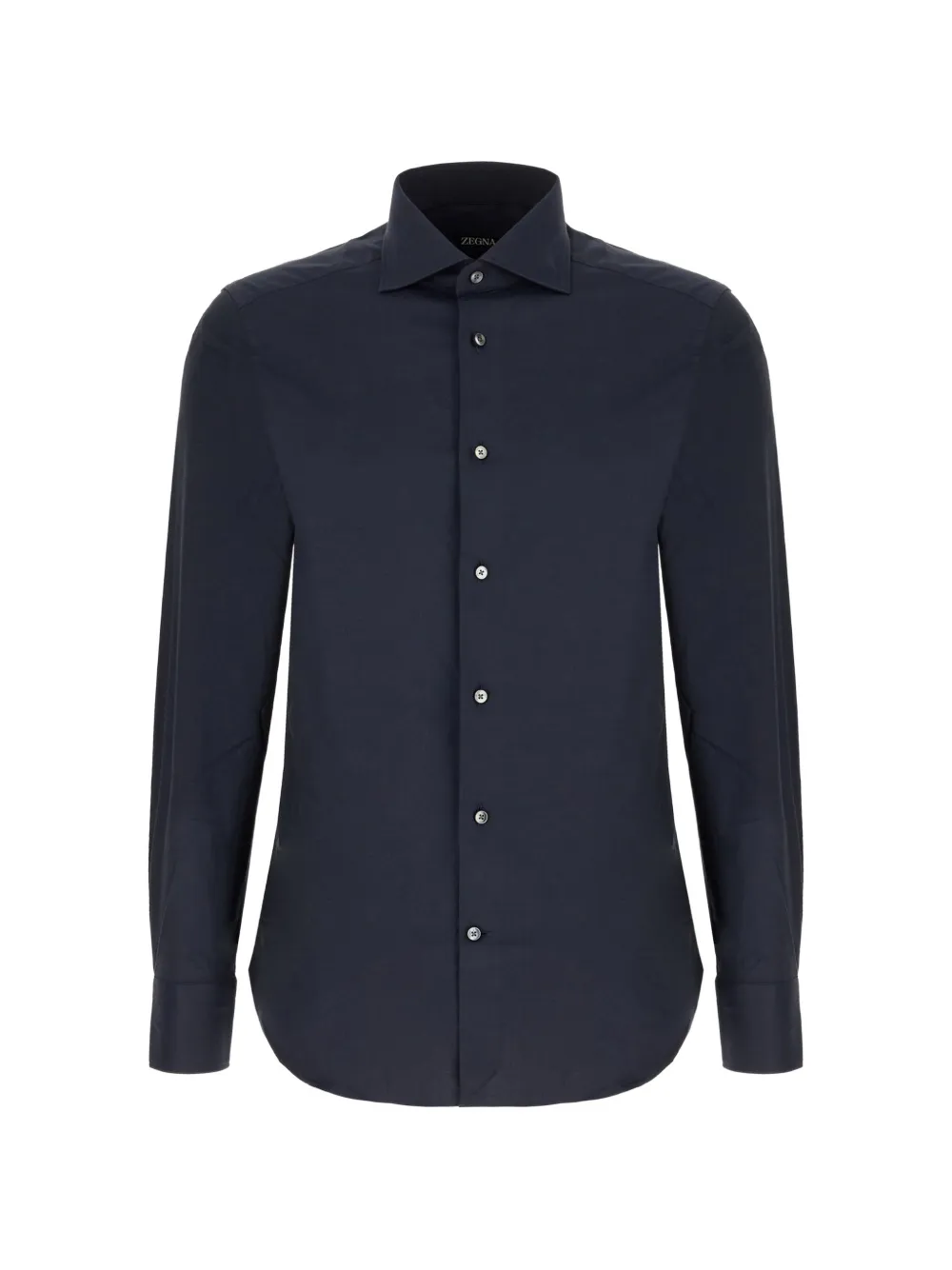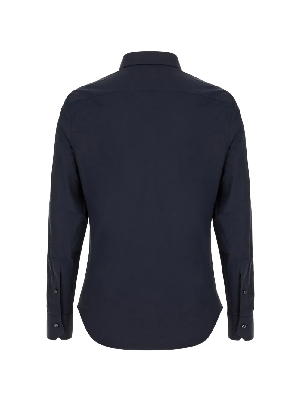 Темно-синяя рубашка с застежкой на пуговицы, длинными рукавами, манжетами на пуговицах и изогнутым подолом