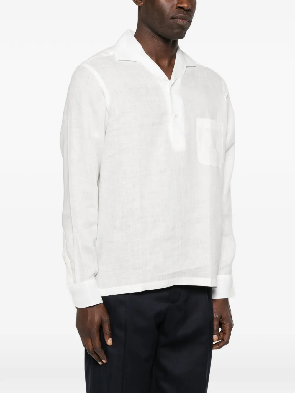 Белый цвет, накладной карман на груди, застежка на пуговицы спереди, длинные рукава, манжеты на пуговицах